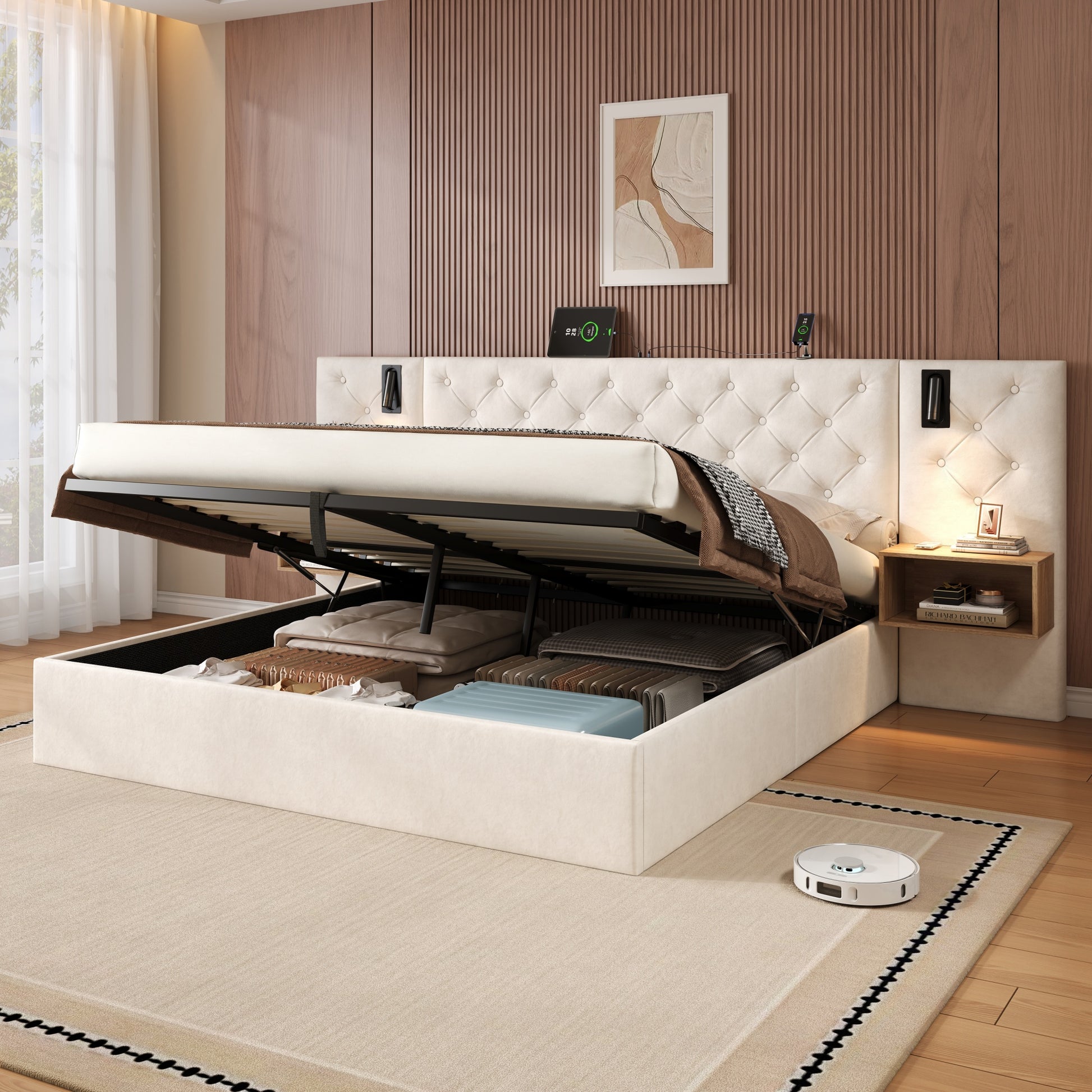 King Upholstered Bed with Charging Station, Reading Light, and Hydraulic Storage, Beige Velvet