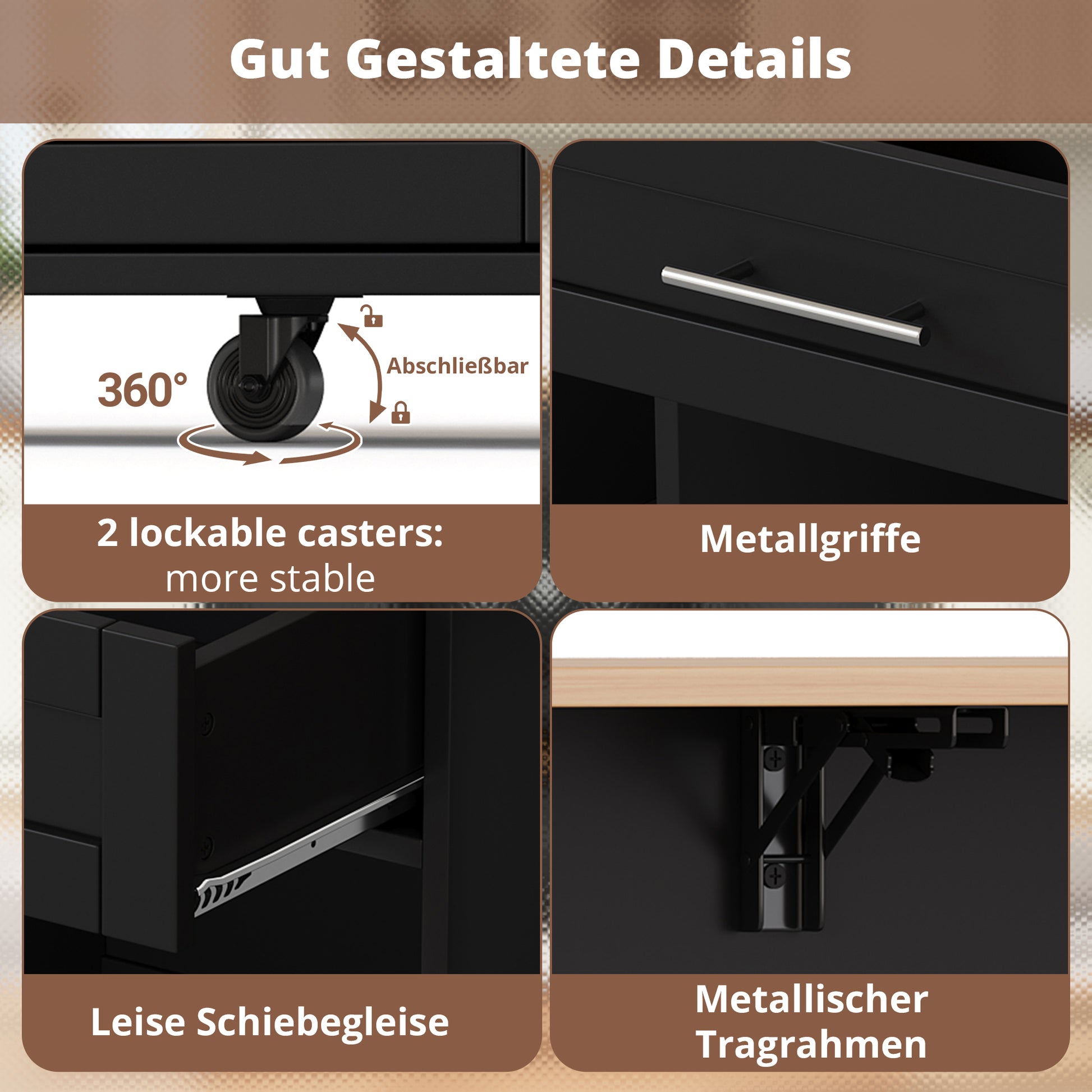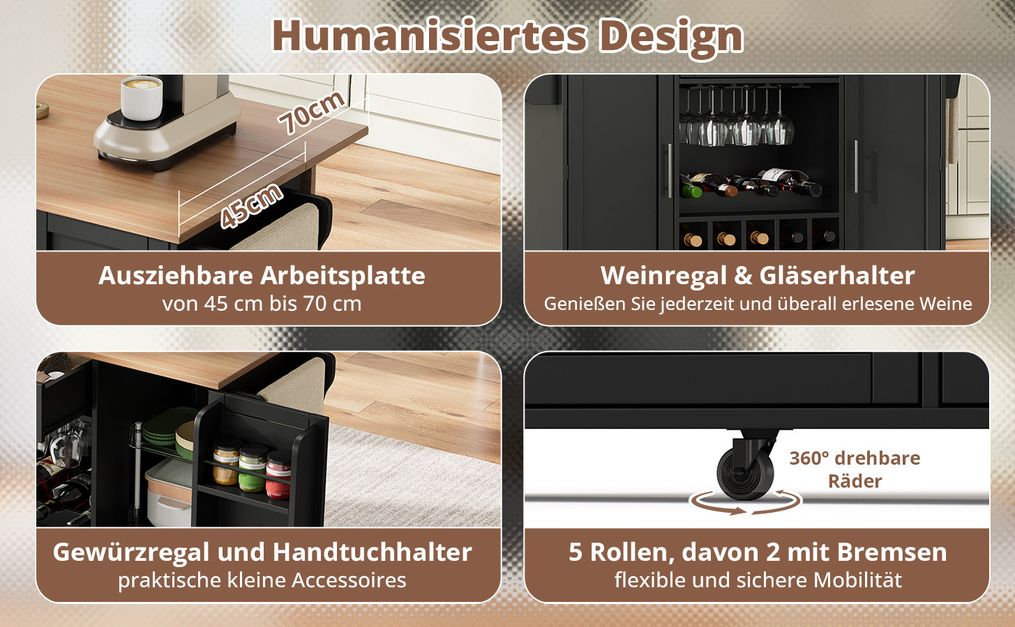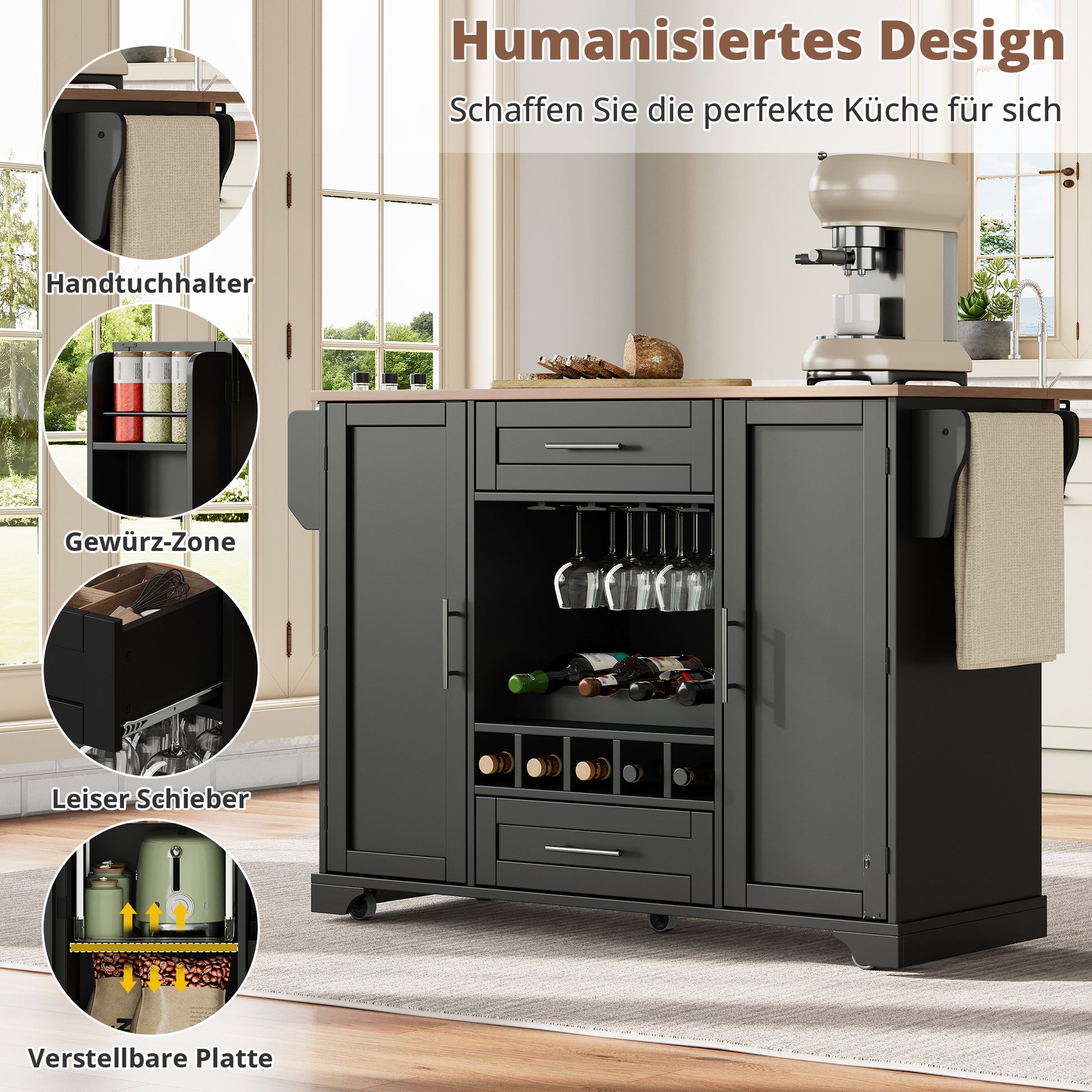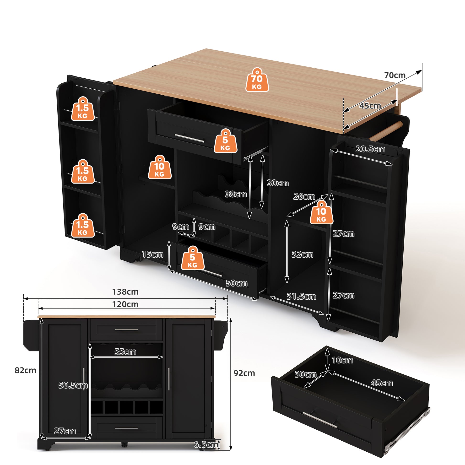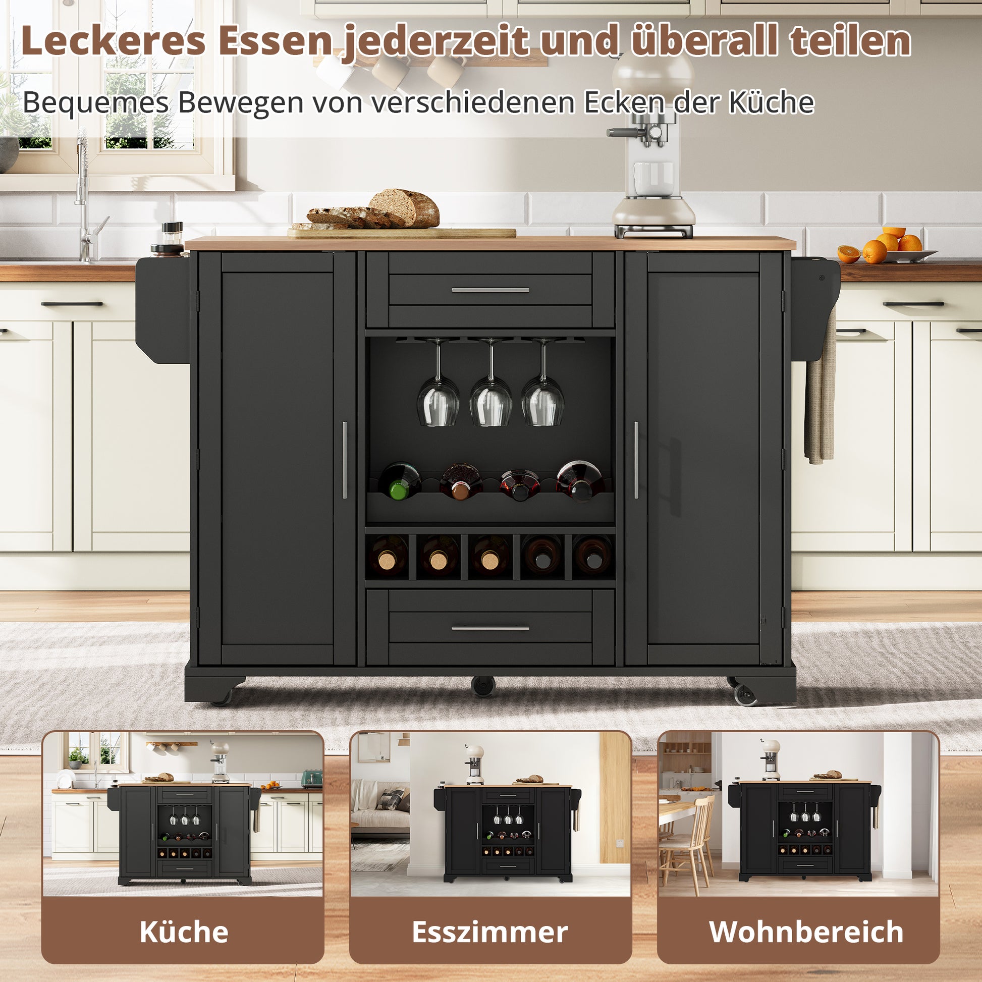 Kitchen Island Cart Folding Worktop Wine Rack Storage - Black