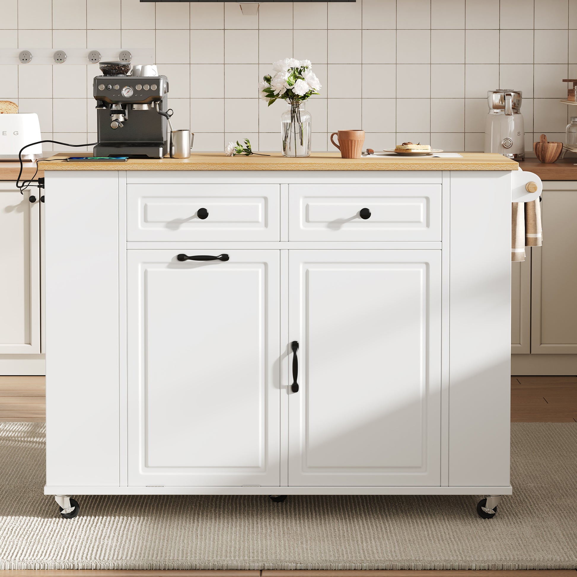 Kitchen Island Mobile Extendable Dining Table Waste Bin Towel Rack Power Strips - White