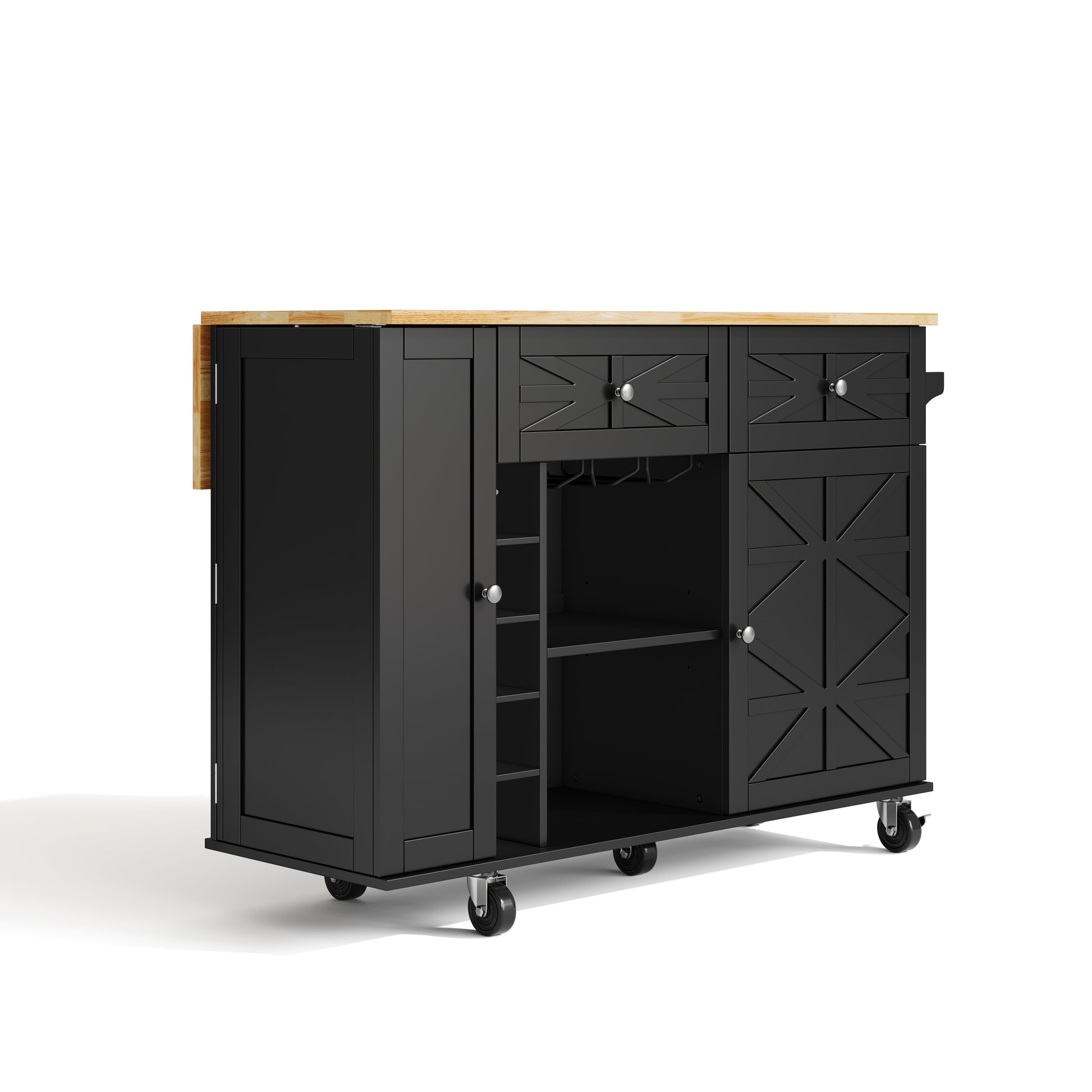 Kitchen Island Mobile Folding Worktop Wine Rack Storage - Black