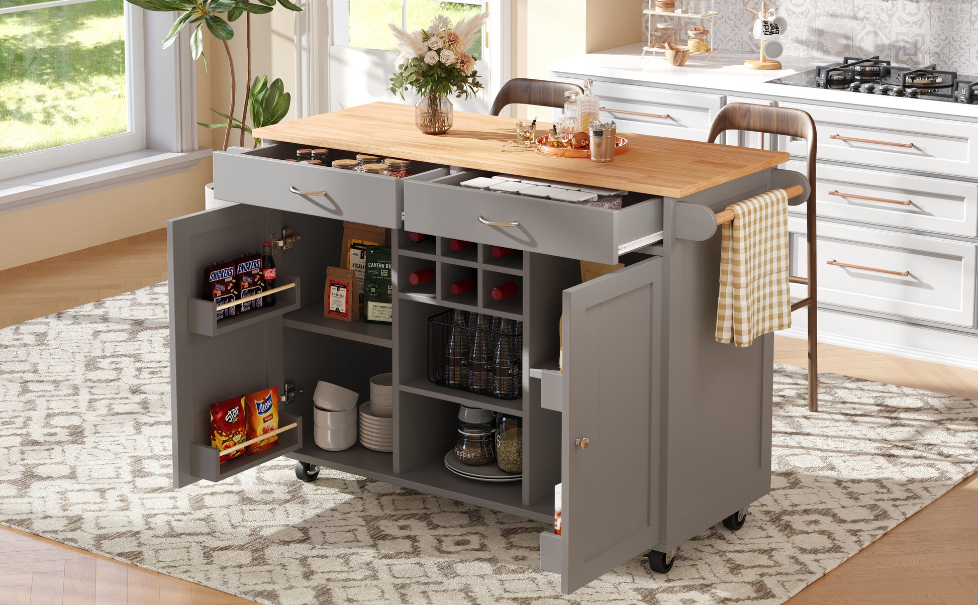 This serving cart is not only suitable for the kitchen or dining room, but can also be used as a sideboard, display shelf, or workbench to meet various functional needs of the family. Its stylish design and multifunctional storage space easily integrate into different interior styles, enhancing the functionality and aesthetics of the entire living environment.