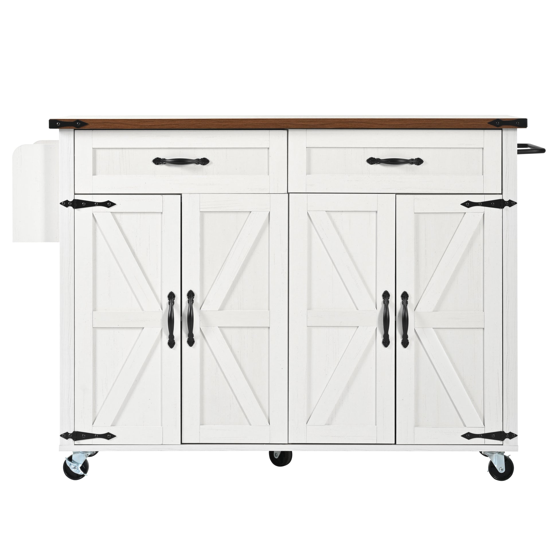 This food cart features shelves on one side for drinks, spirits, or spice jars, and a towel rack on the other. It also has two cabinets with doors and two drawers for versatile storage.