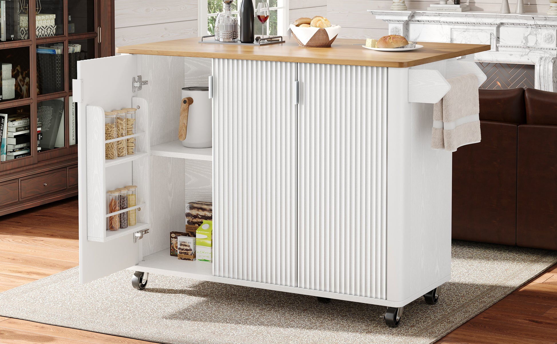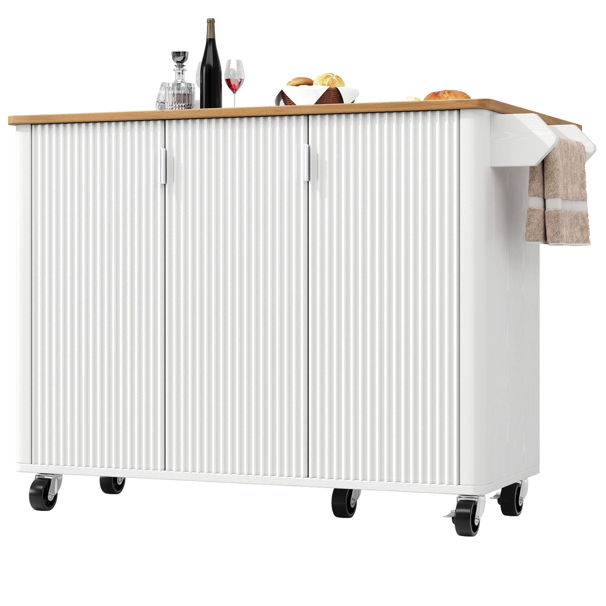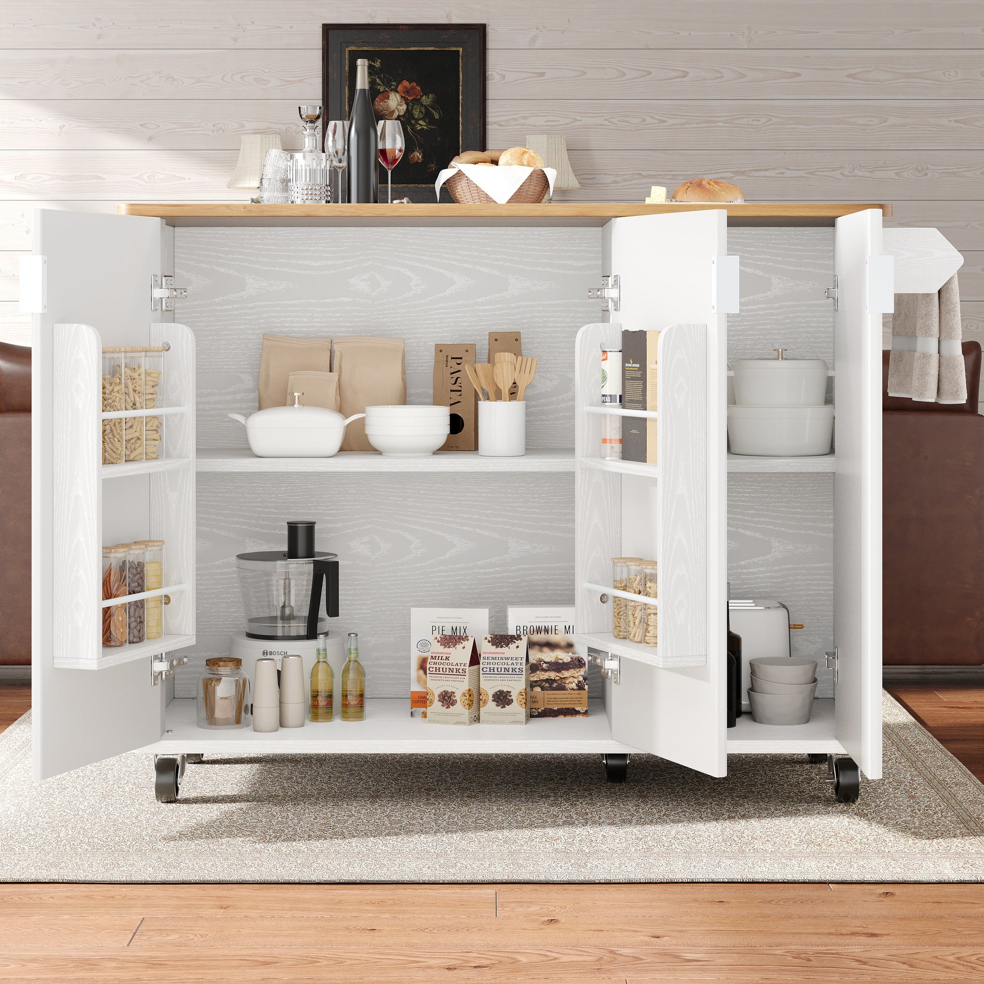 Equipped with five 360-degree swivel casters, two of which can be locked, to easily move the island to the kitchen, dining room, living room, or any other space.