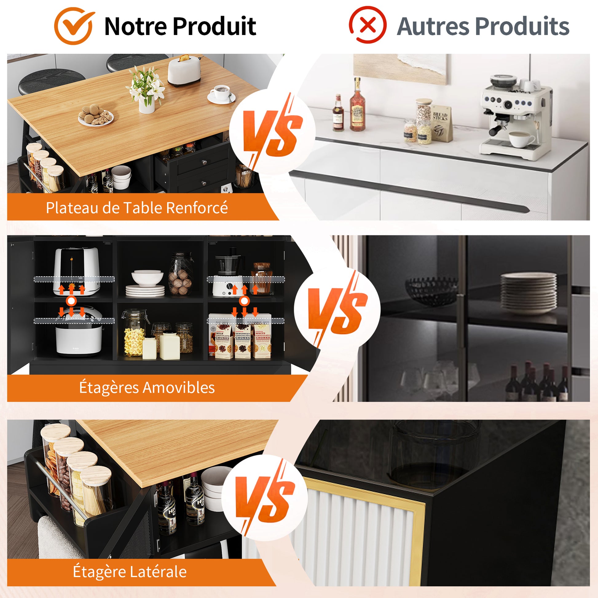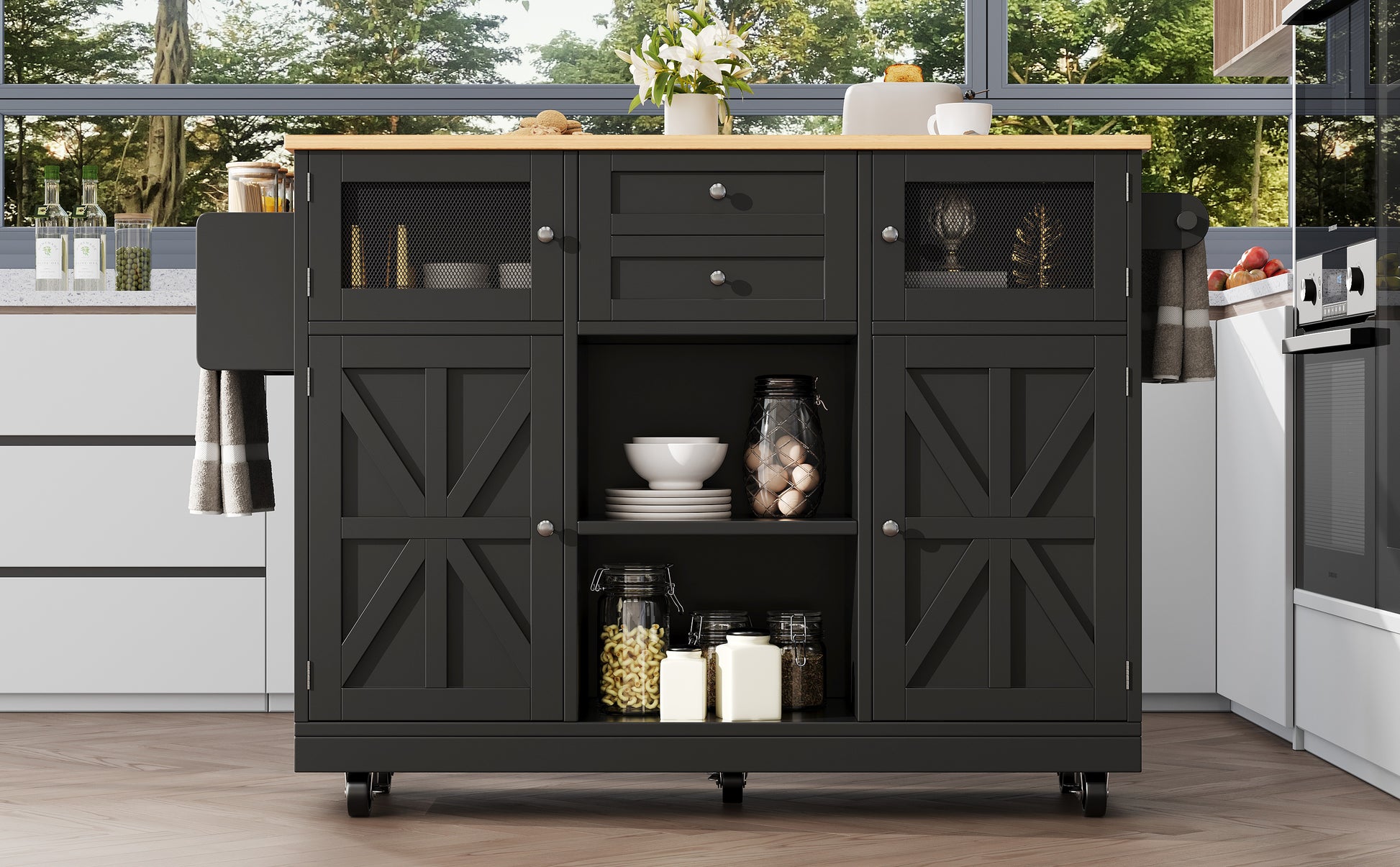 Kitchen Island Trolley Sideboard with Worktop Towel Rail Adjustable Storage Black