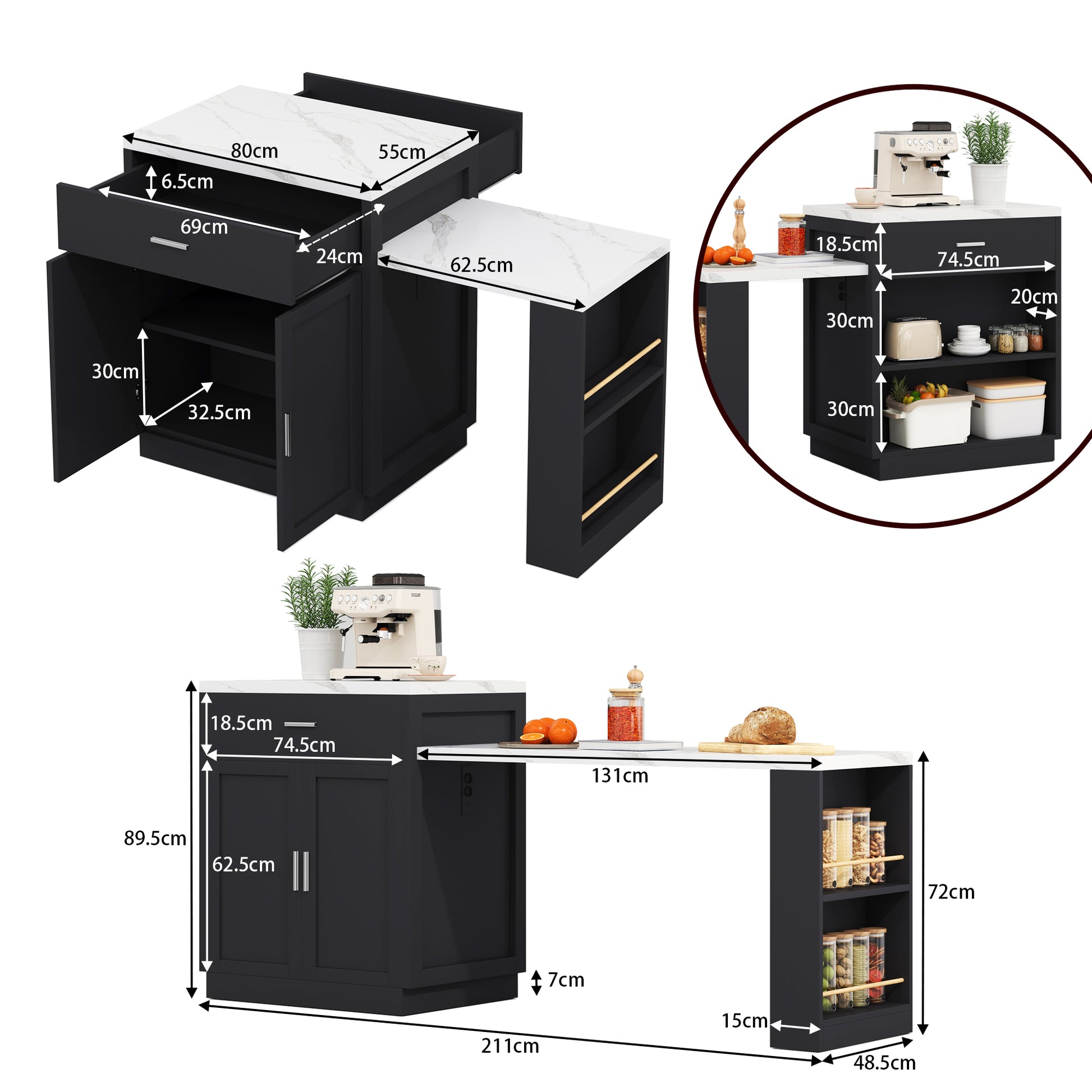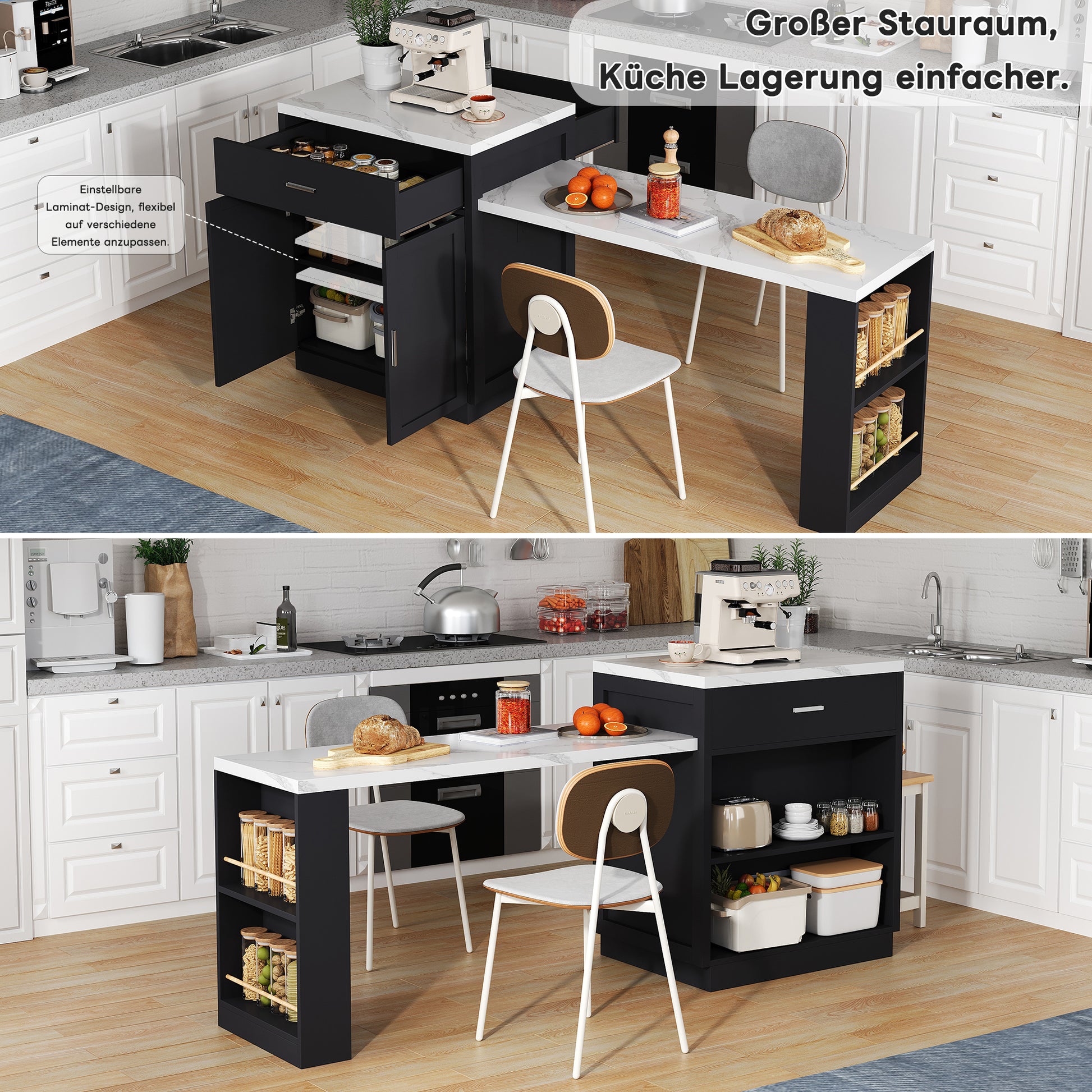 Kitchen Island with Extendable Dining Table for 4-6 People, Power Outlet and Storage Drawers, Black and White Marble Look