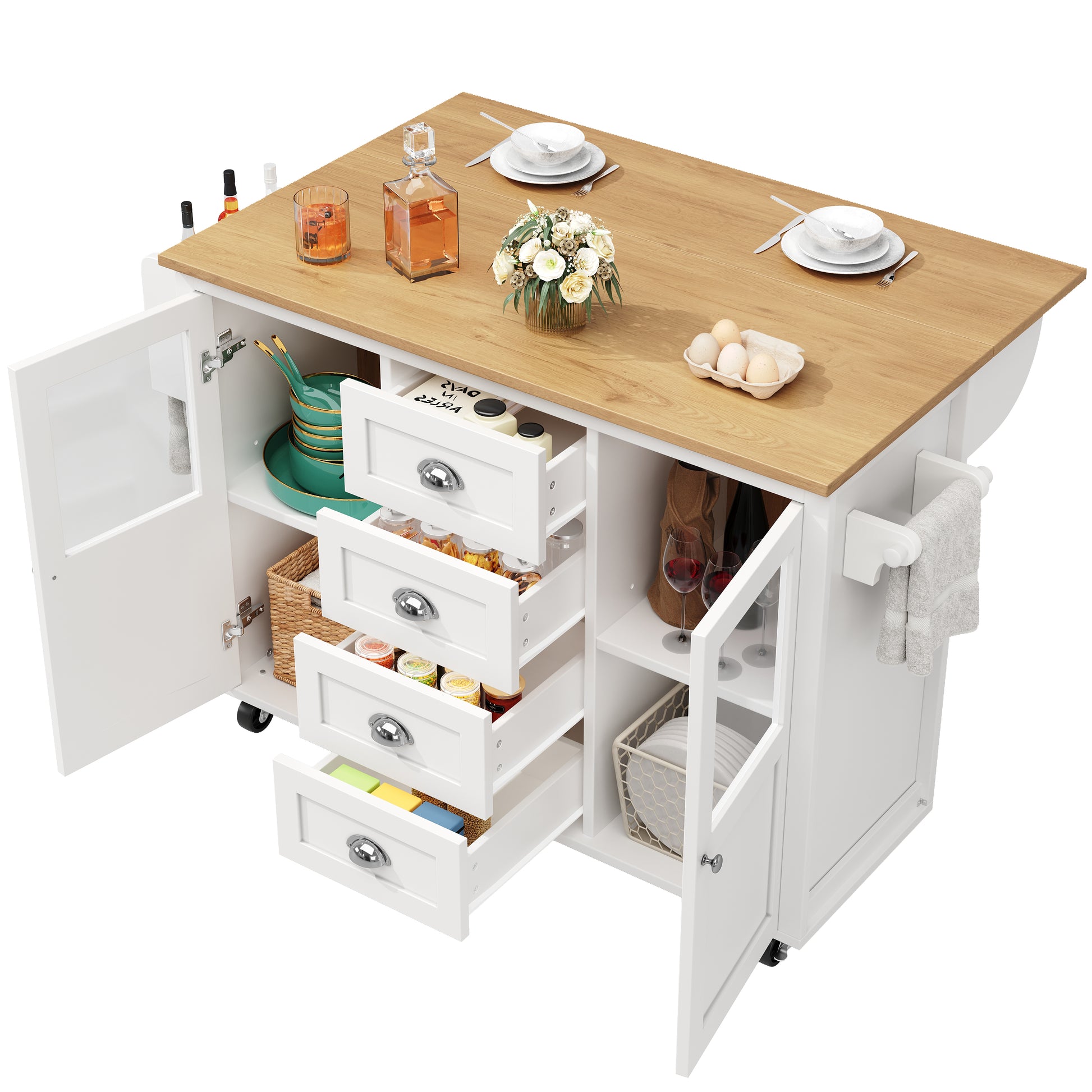 The island provides ample storage space with four drawers, separate compartments behind double doors, and glass panels for display. For greater convenience and efficiency, it includes towel and spice racks on both sides. The unit is highly functional and movable, featuring four 360-degree swivel casters that allow you to easily transport it between your kitchen, dining room, and living room.