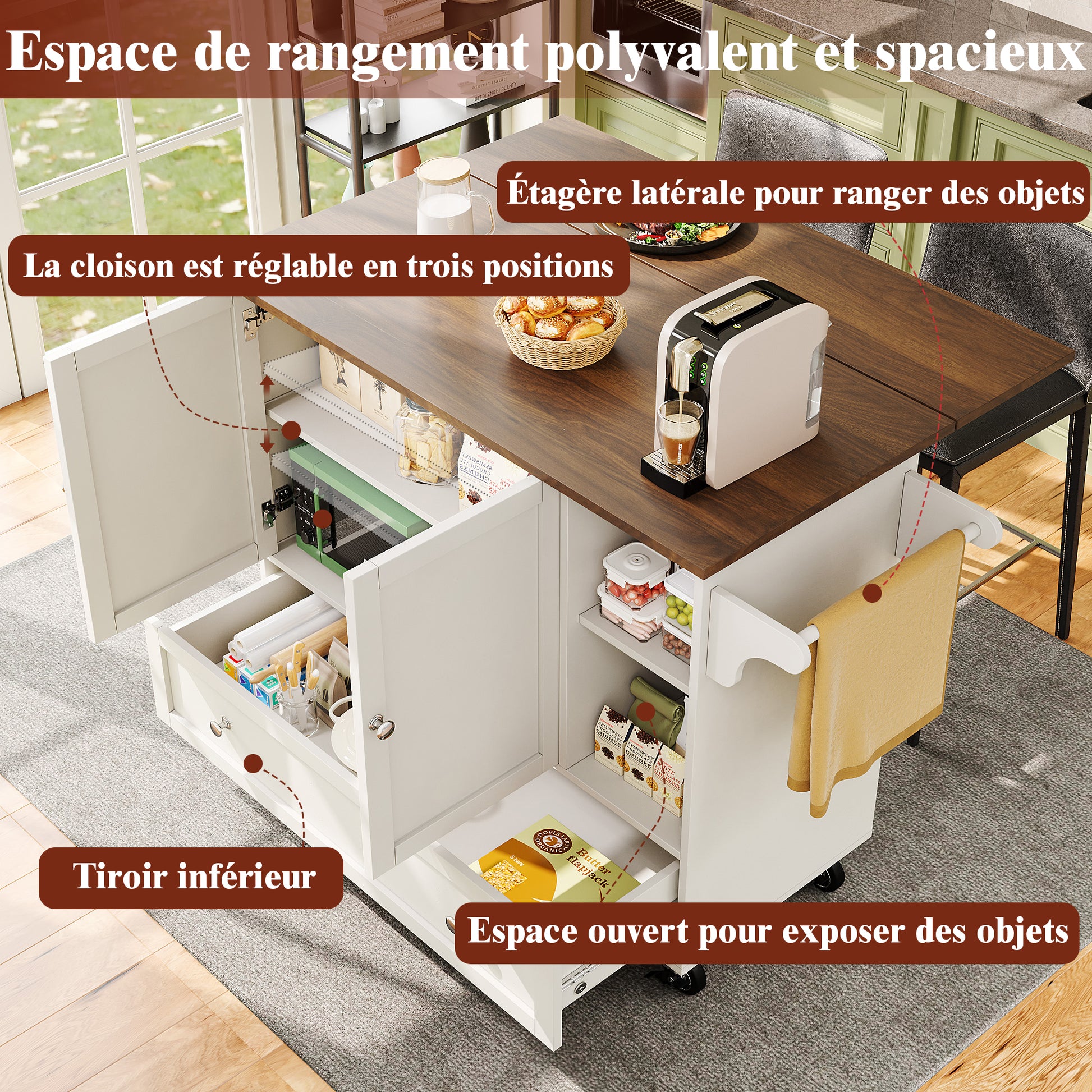 This kitchen trolley features a foldable tabletop that extends up to 71 cm for comfortable dining. Its durable metal frame and lockable wheels ensure quality, flexibility, and stability.