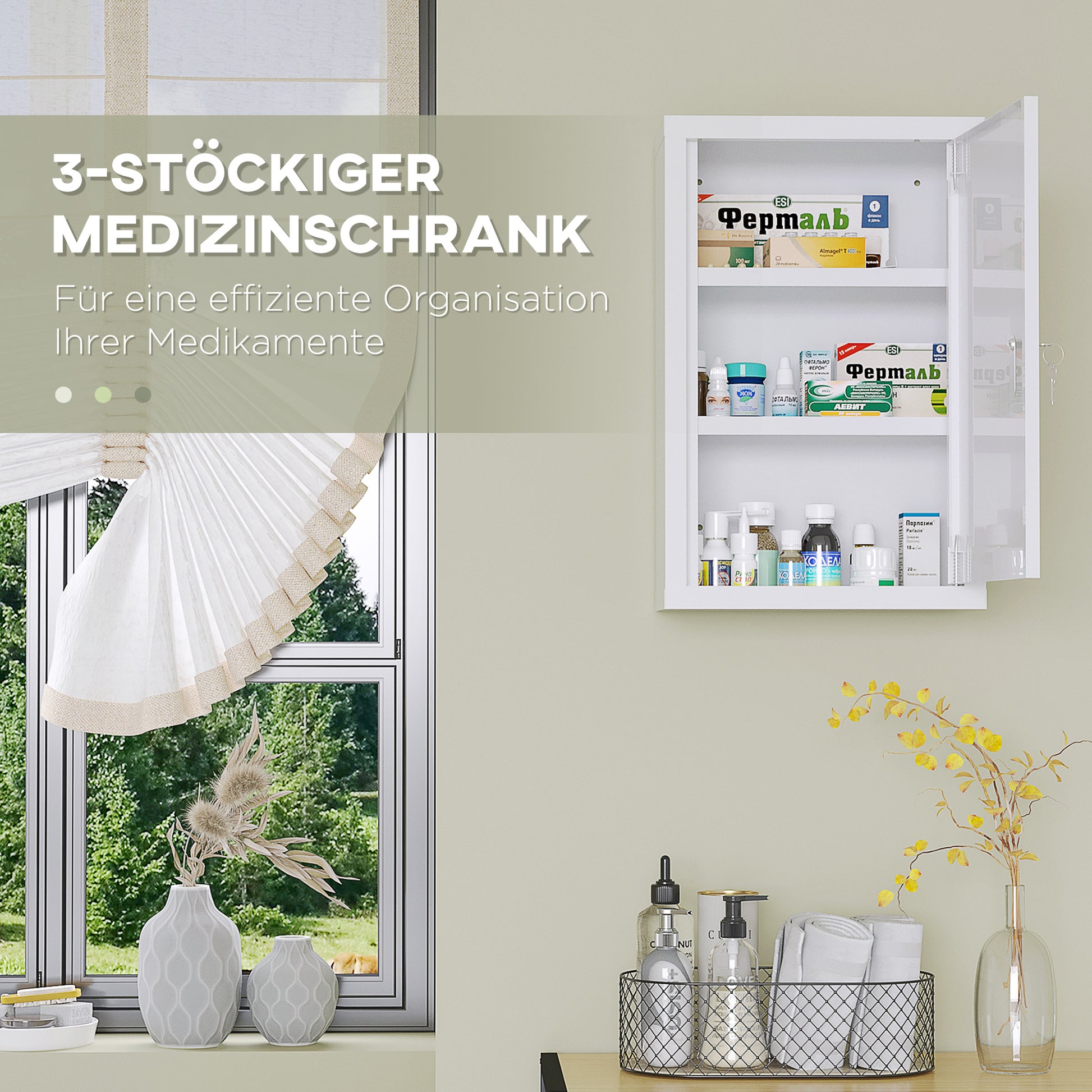 This wall cabinet offers ample storage with three shelves, perfect for keeping medical supplies, prescription medications, and similar items easily accessible.