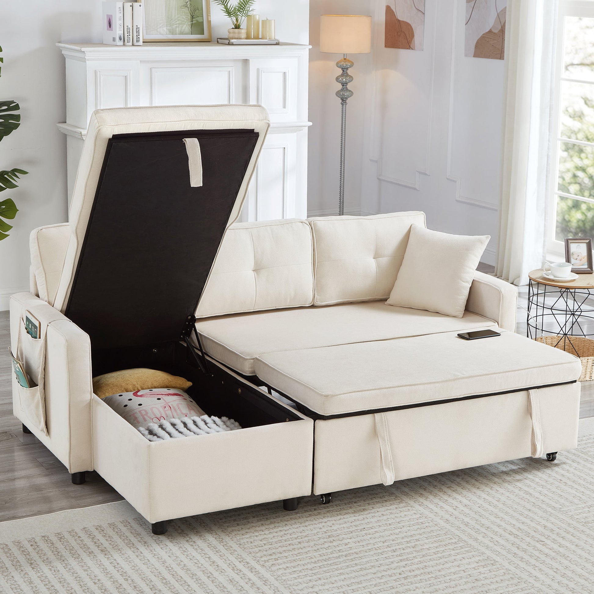 L-Shaped Pull Out Sleep Sofabed, Modern Reversible Sleeper Sectional Sofa with Storage Chaise, Drop-Down Table, Cup Holders and Charging Ports (USB & Type-C), Beige