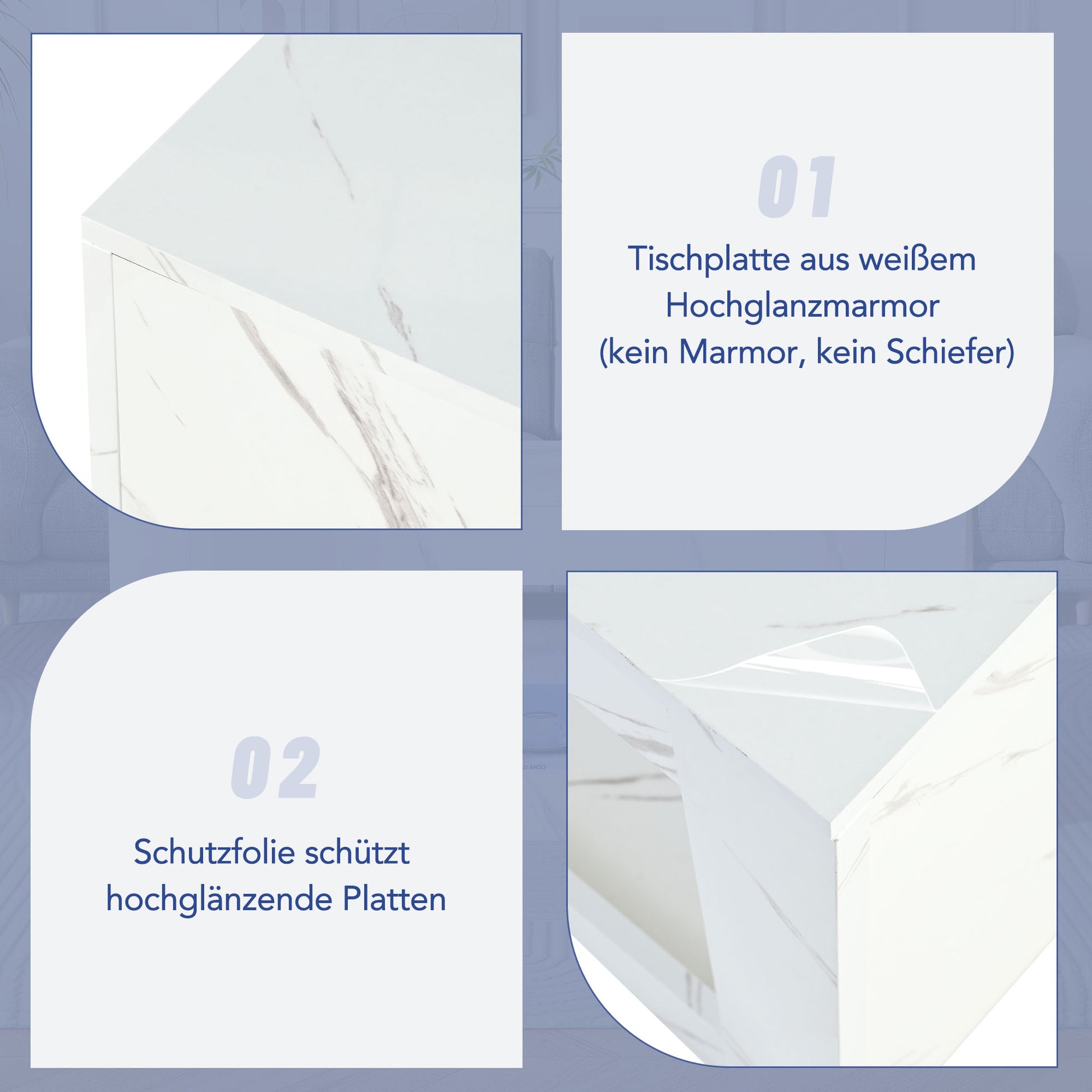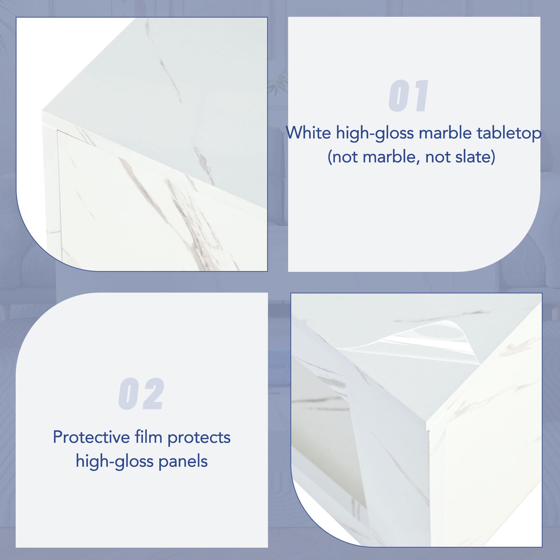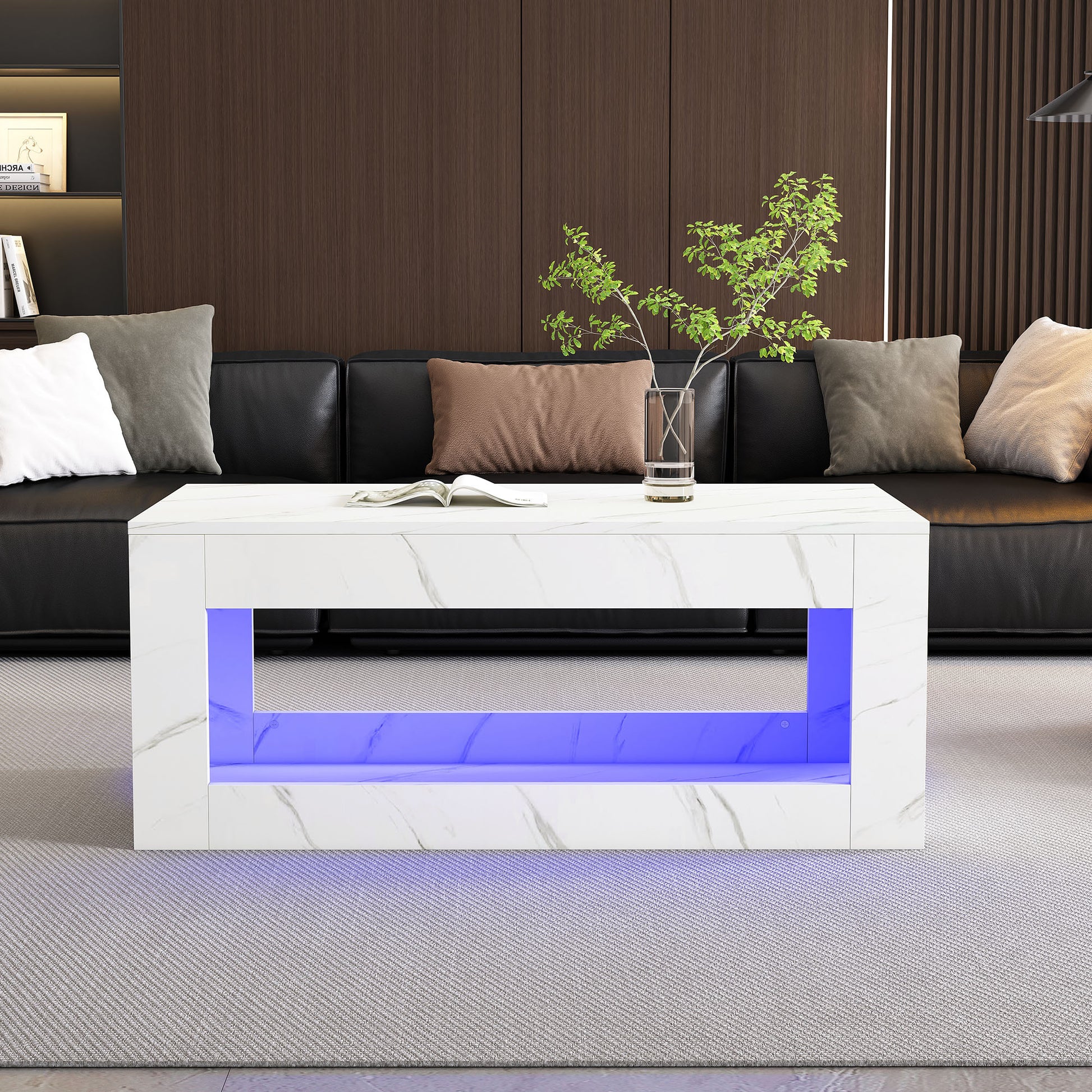 LED Coffee Table High-Gloss Remote Control Marble Print - White