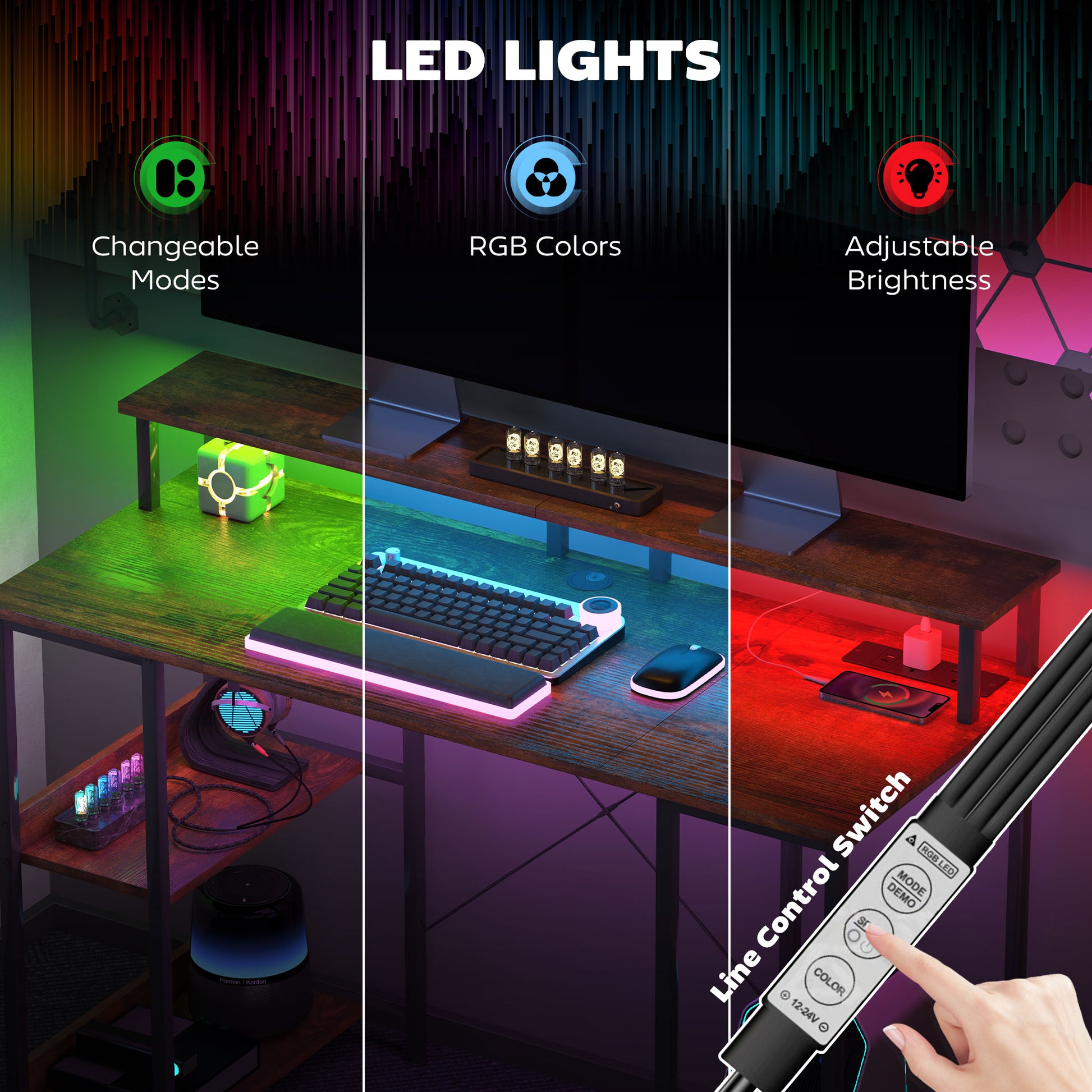 LED Computer Desk with Power Outlets and Shelves - Rustic Brown