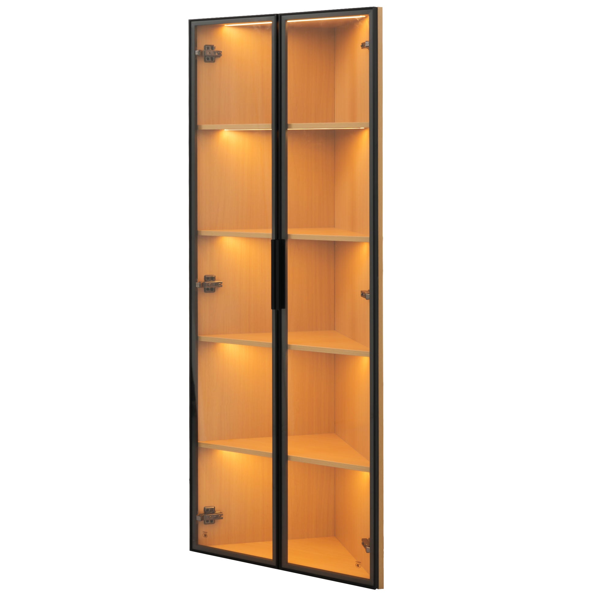 Bring style, light, and organization to your home with this high-quality glass display cabinet in an oak finish. This display cabinet impresses with its modern, space-saving corner design and the combination of an MDF wood structure, reinforced aluminum frame, and tempered glass. Thanks to the integrated LED strips under each shelf, every figurine, model, or decorative object is bathed in a soft, warm light – perfect for creating an inviting and cozy atmosphere.