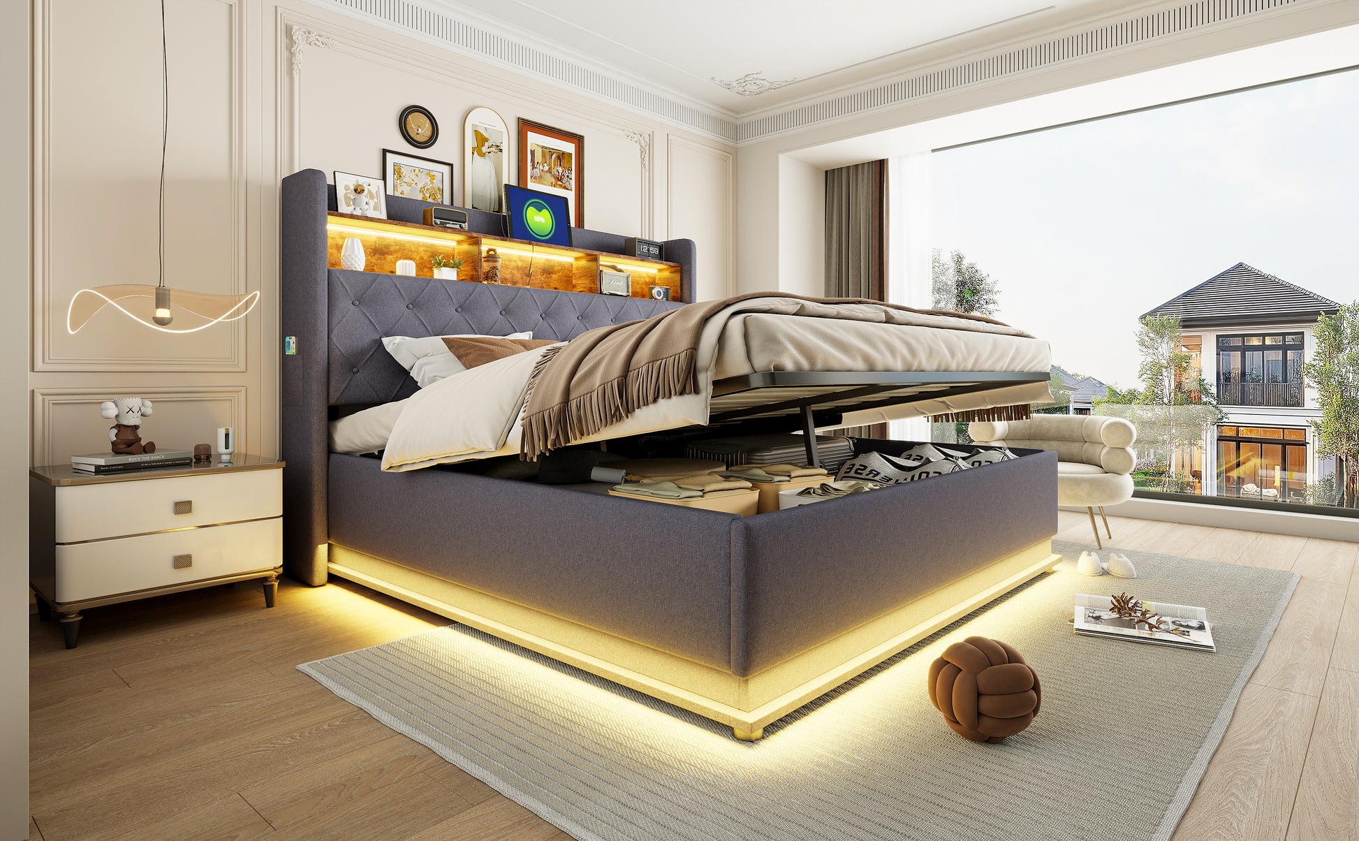Enhance your bedroom with our luxurious LED upholstered bed, featuring integrated USB charging ports and convenient hydraulic storage. Crafted from high-quality materials, this bed not only elevates your sleeping experience but also adds a touch of modern elegance to your room.