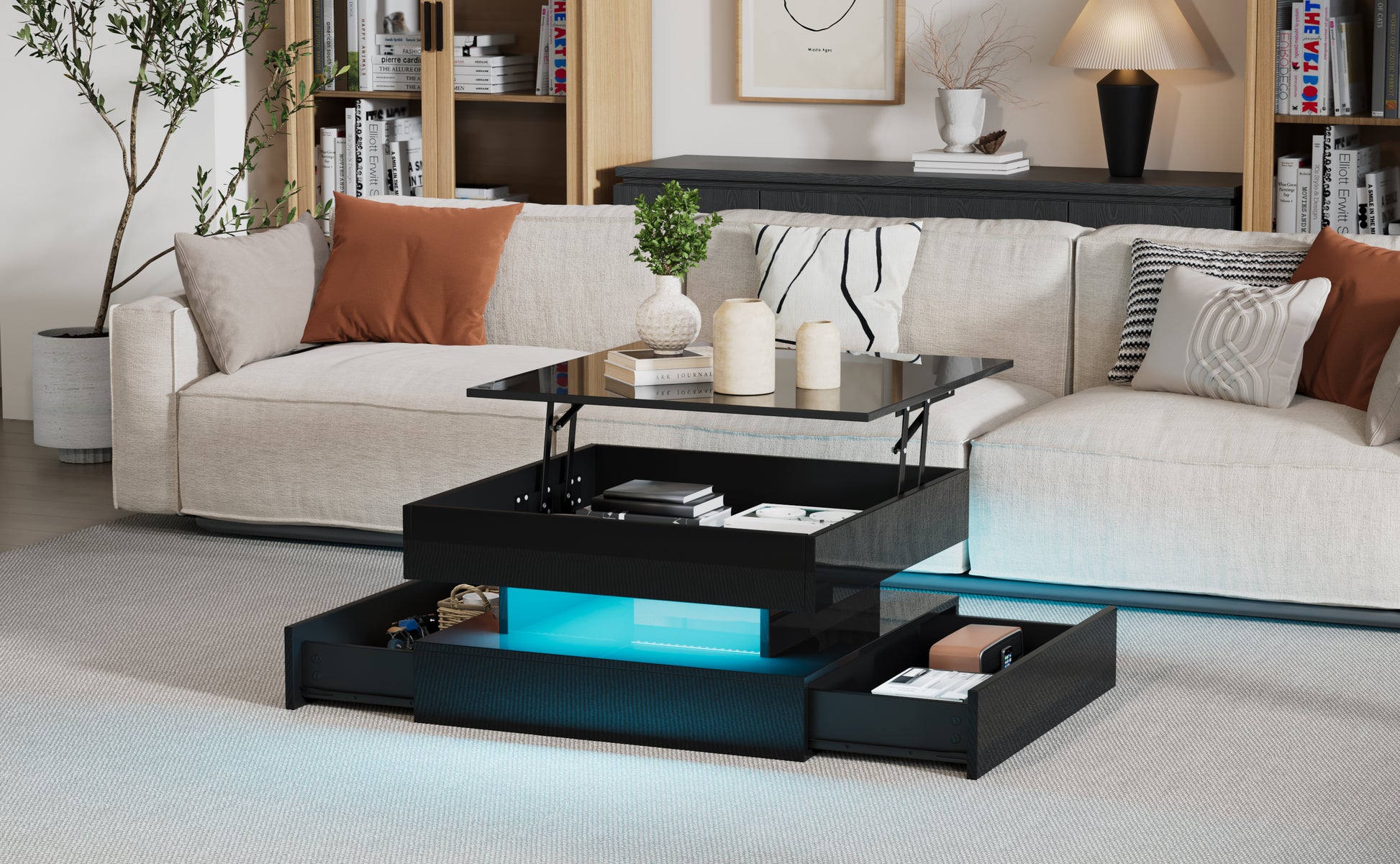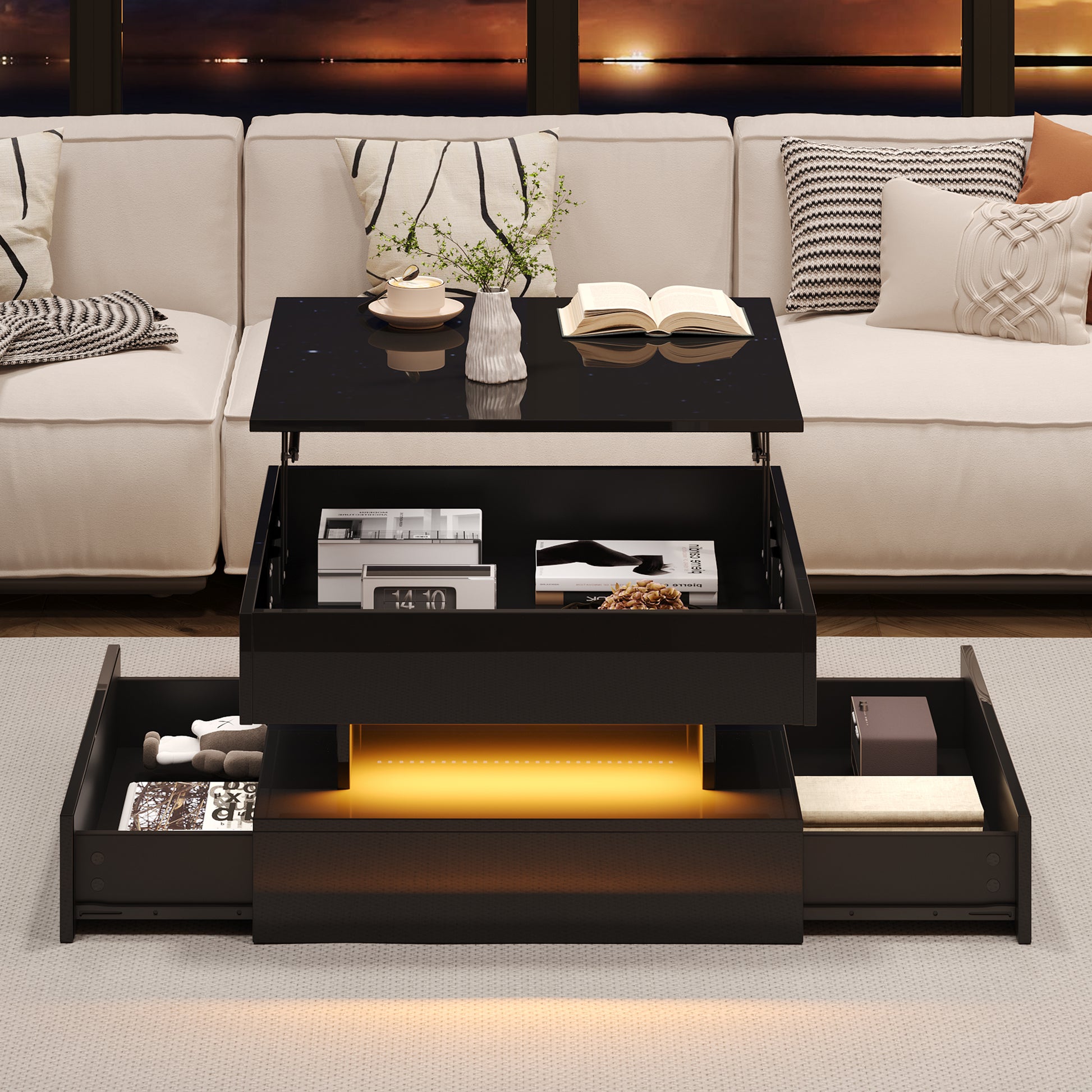 Liftable Coffee Table, 65 x 65 x 38.5 cm, High-Gloss with LED Light Strip, 2 Drawers, Black