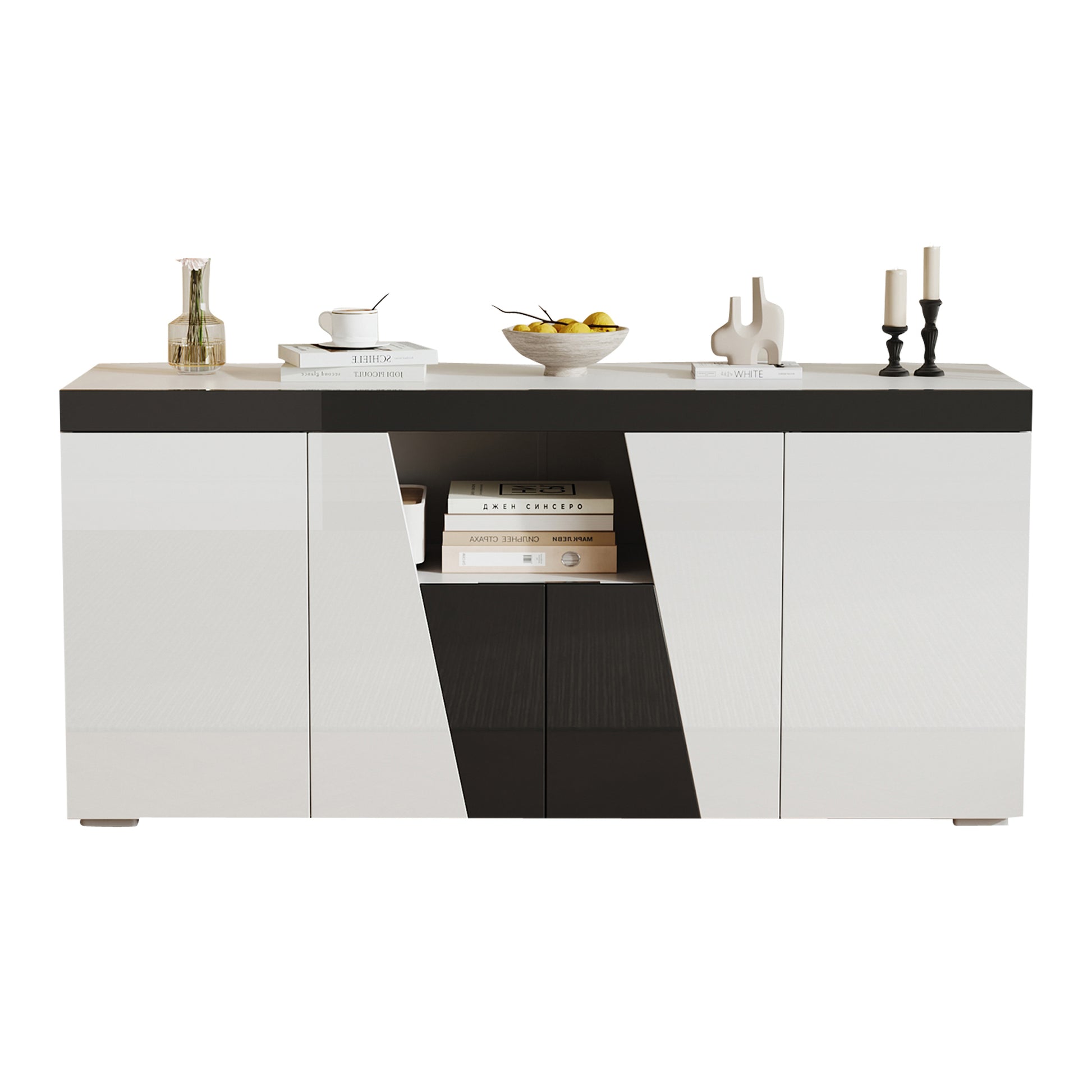 Living Room Sideboard with 4 Doors, Angled Design & LED Light Strip, Black and White Chipboard