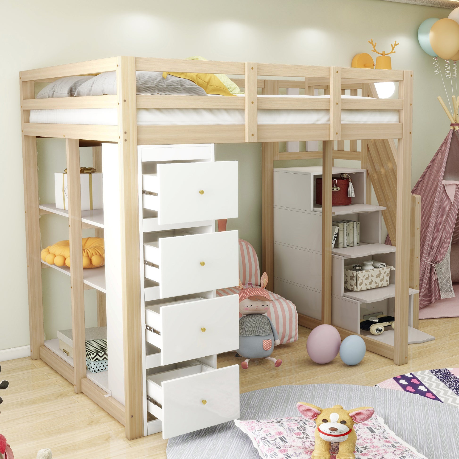 Loft Bed 140x200cm with Storage Drawers, Shelves, & Ladder, Solid Wood