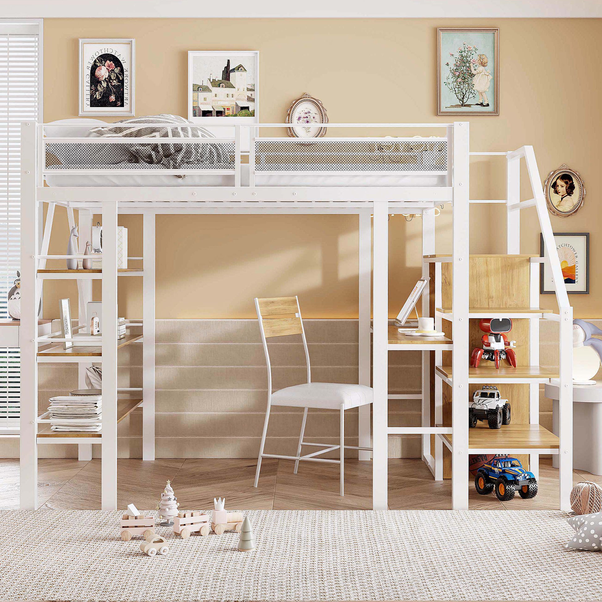 Loft Bed, 140x200cm with Storage Shelf, Desk, Wardrobe, Safety Steps, Iron, White