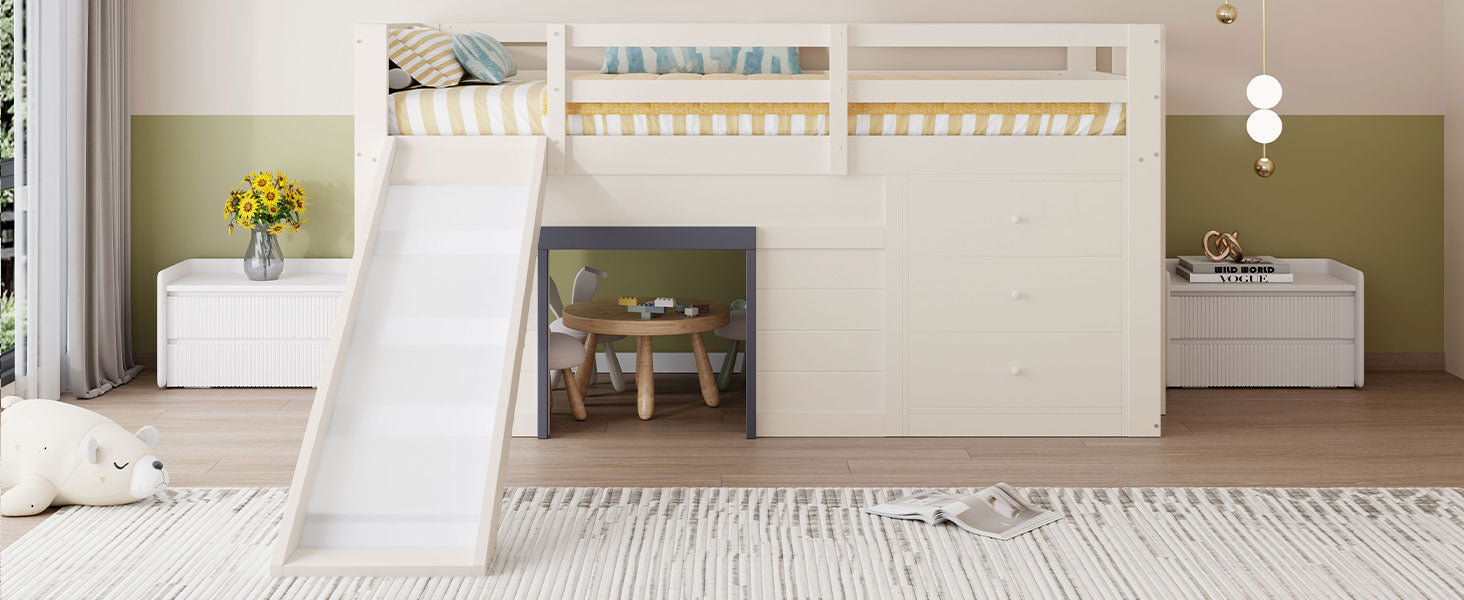 90 x 200 cm Low Loft Bed with Slide, Three Drawers, and Two Doors, Cream
