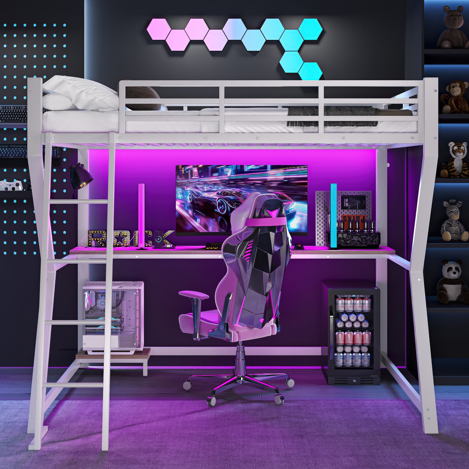 Loft Bed, 90 x 200 cm, Remote-Controlled Ambient Lighting, Computer Shelf, Desk