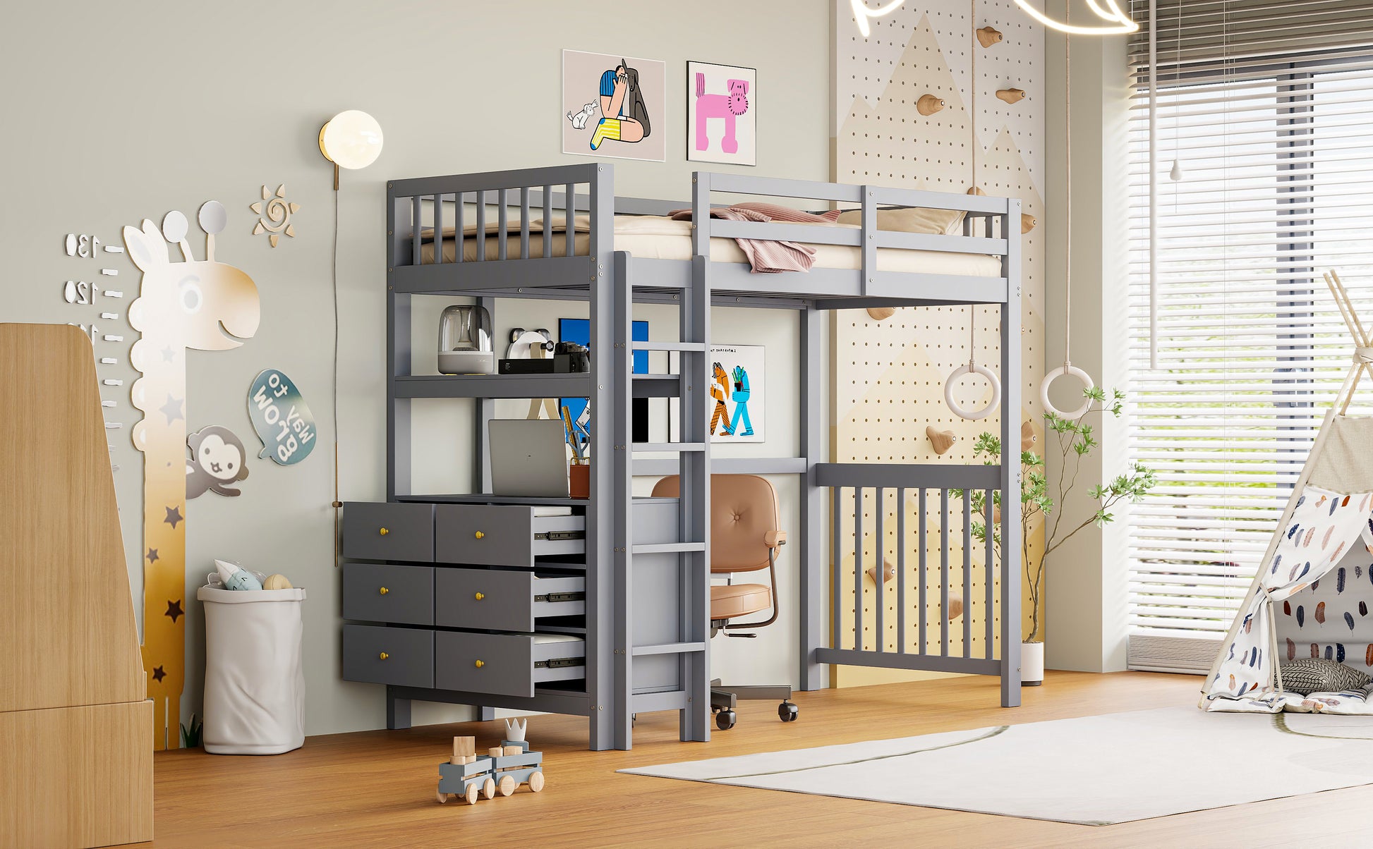 Loft Bed, 90x200cm with Ladder, Drawers, Shelves, Slatted Frame, Pinewood, Grey