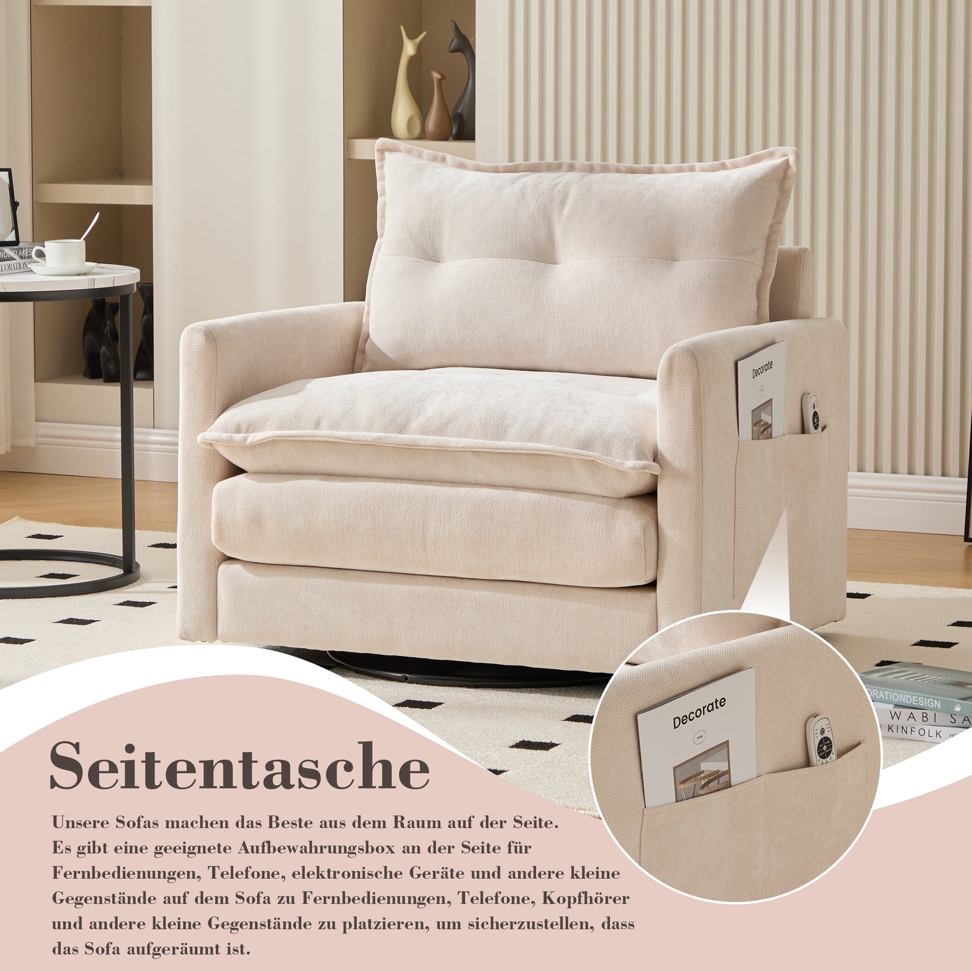 Lounge Chair, 360° Rotating, Armrests & Cushions, Modern Style