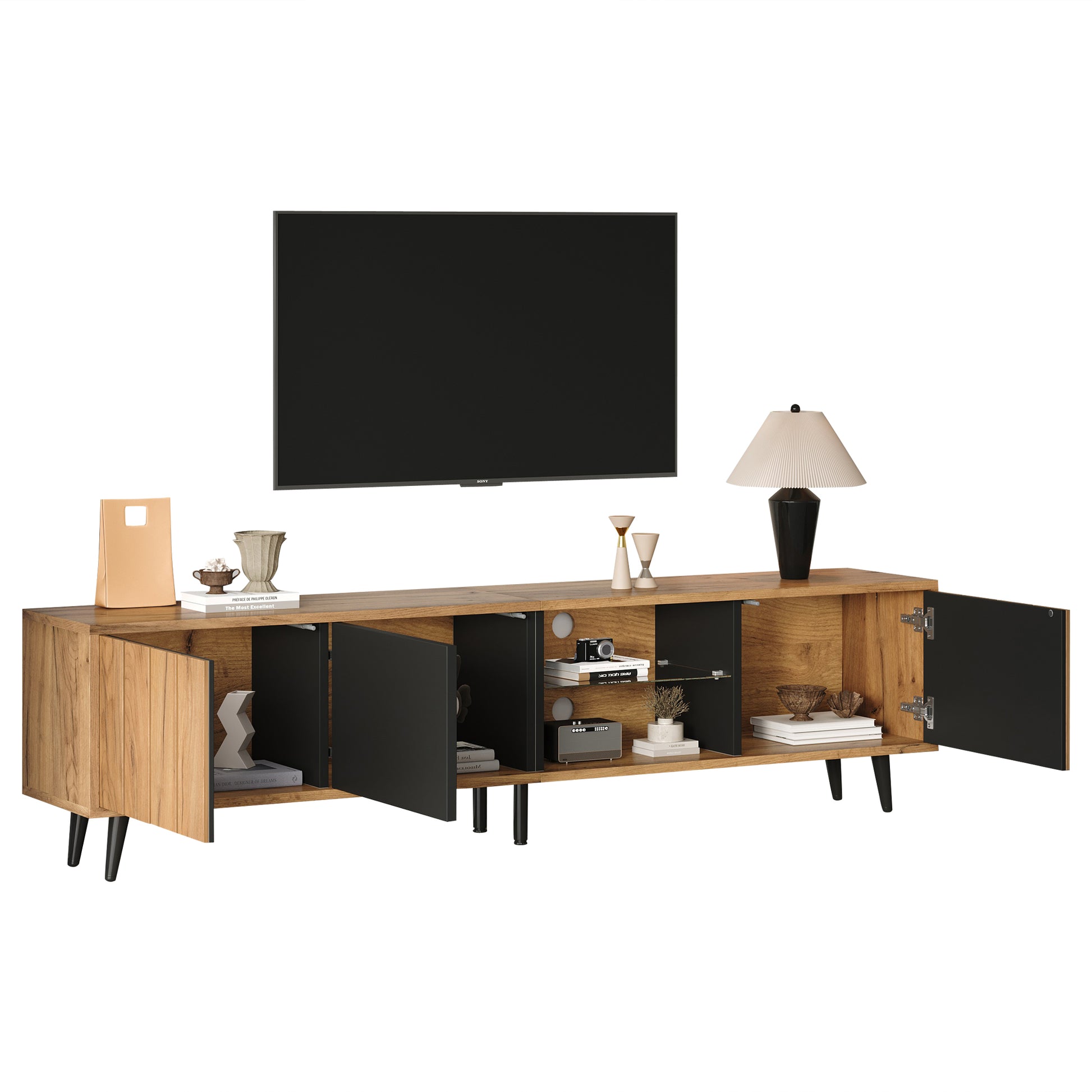 Total size: 175 x 31.5 x 45 cm, TV cabinet, wood + black, divided into 3 levels, with 3 cabinets (3 doors), a semi-open shelf in the middle separated by tempered glass, creating a double-layered shelving unit. The recommended total load capacity is 30 kg, with 6 support legs, suitable for TVs up to 75 inches. Material: particle board.