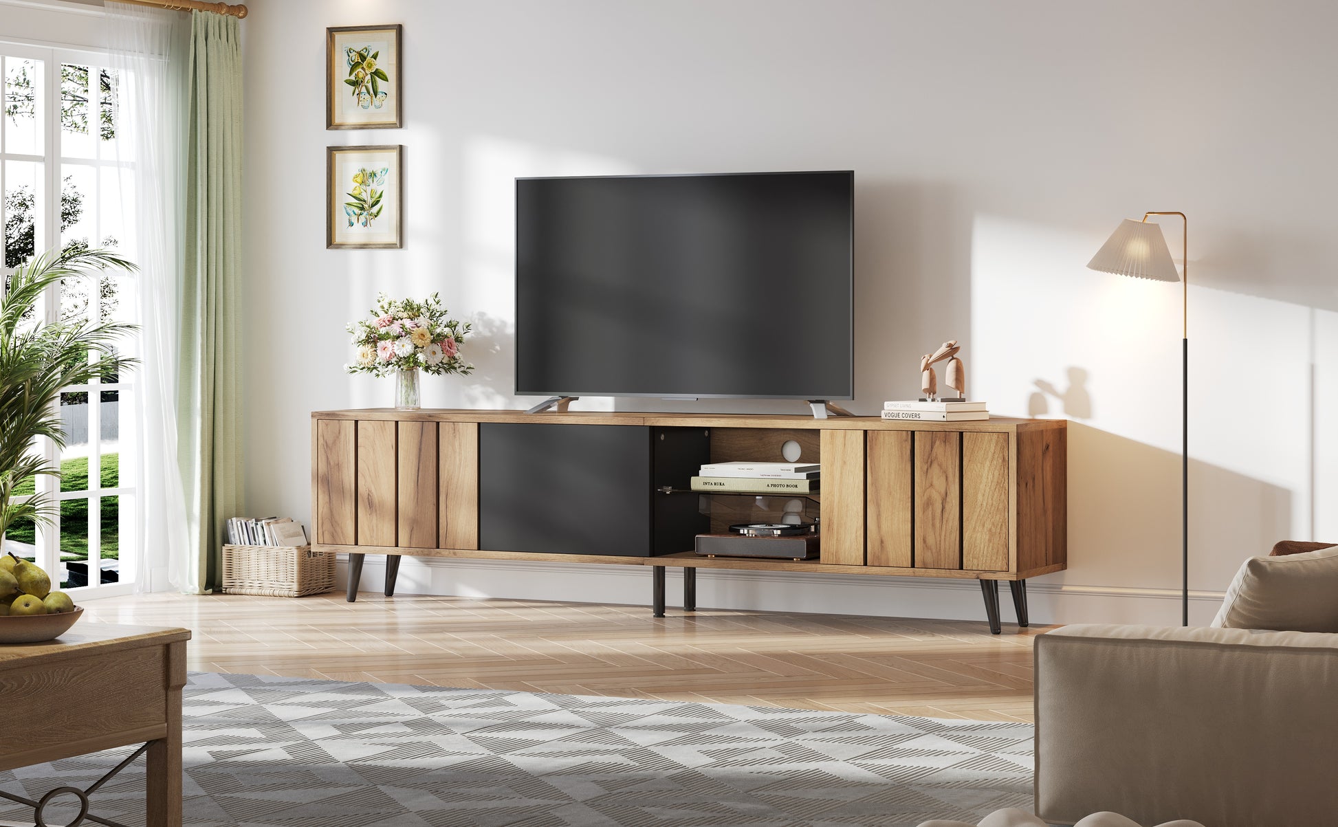 Original wood + black splices / tempered glass / 3 cabinets / 3-layer design / simple / Suitable for 75-inch TVs