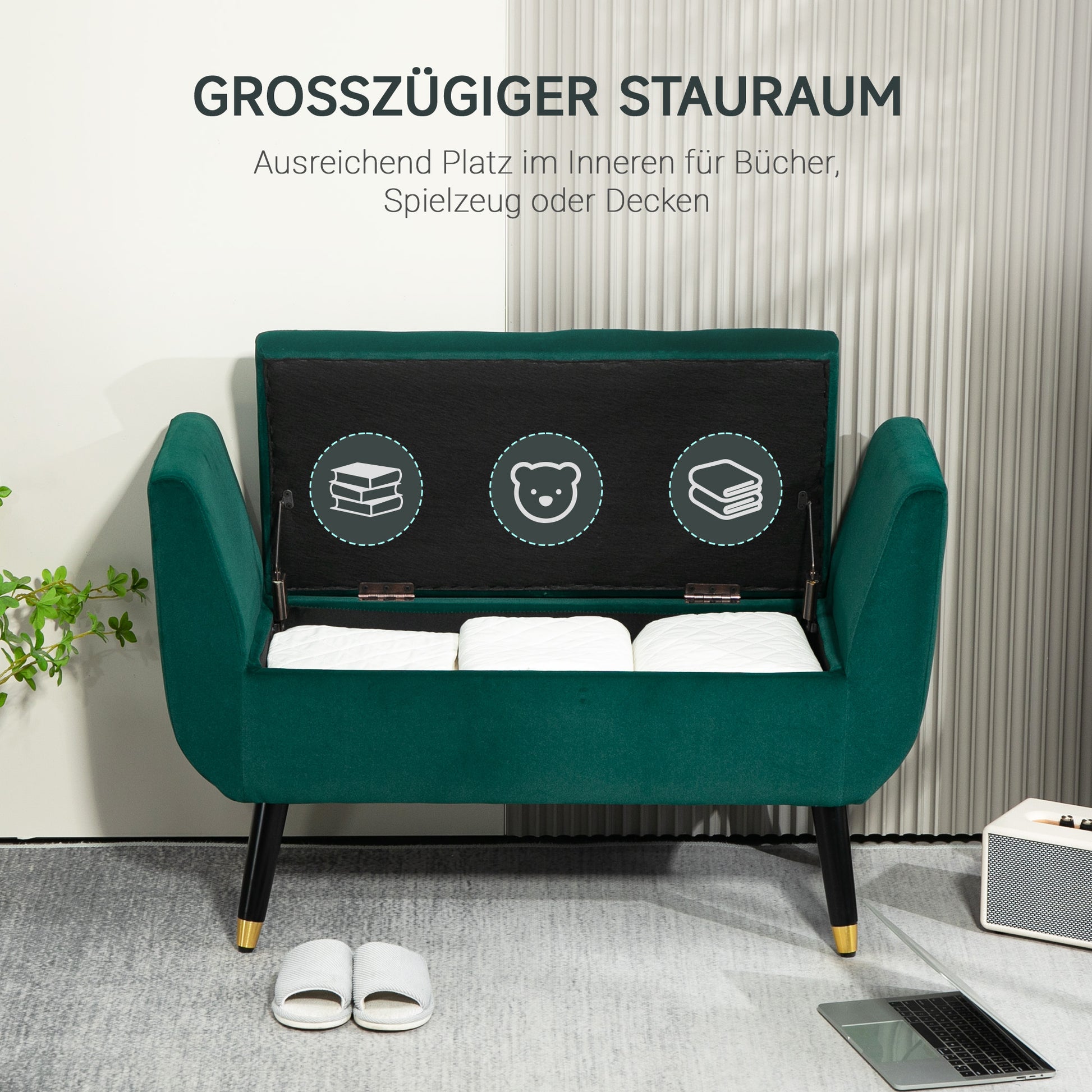 Luxury Upholstered Bench, Storage Armrests Chest, Velvet Polyester Rubberwood Green