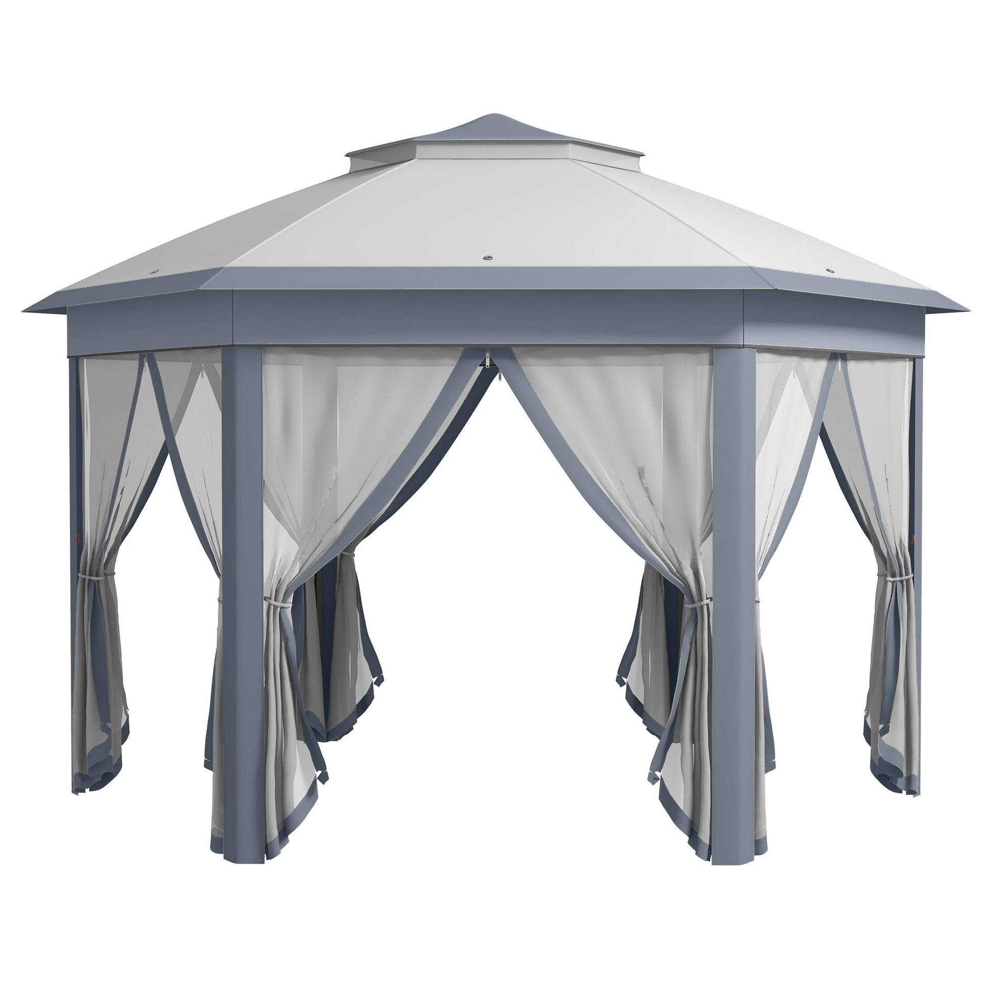 Metal Frame Hexagon Gazebo, 3 x 4m with Curtains - Grey