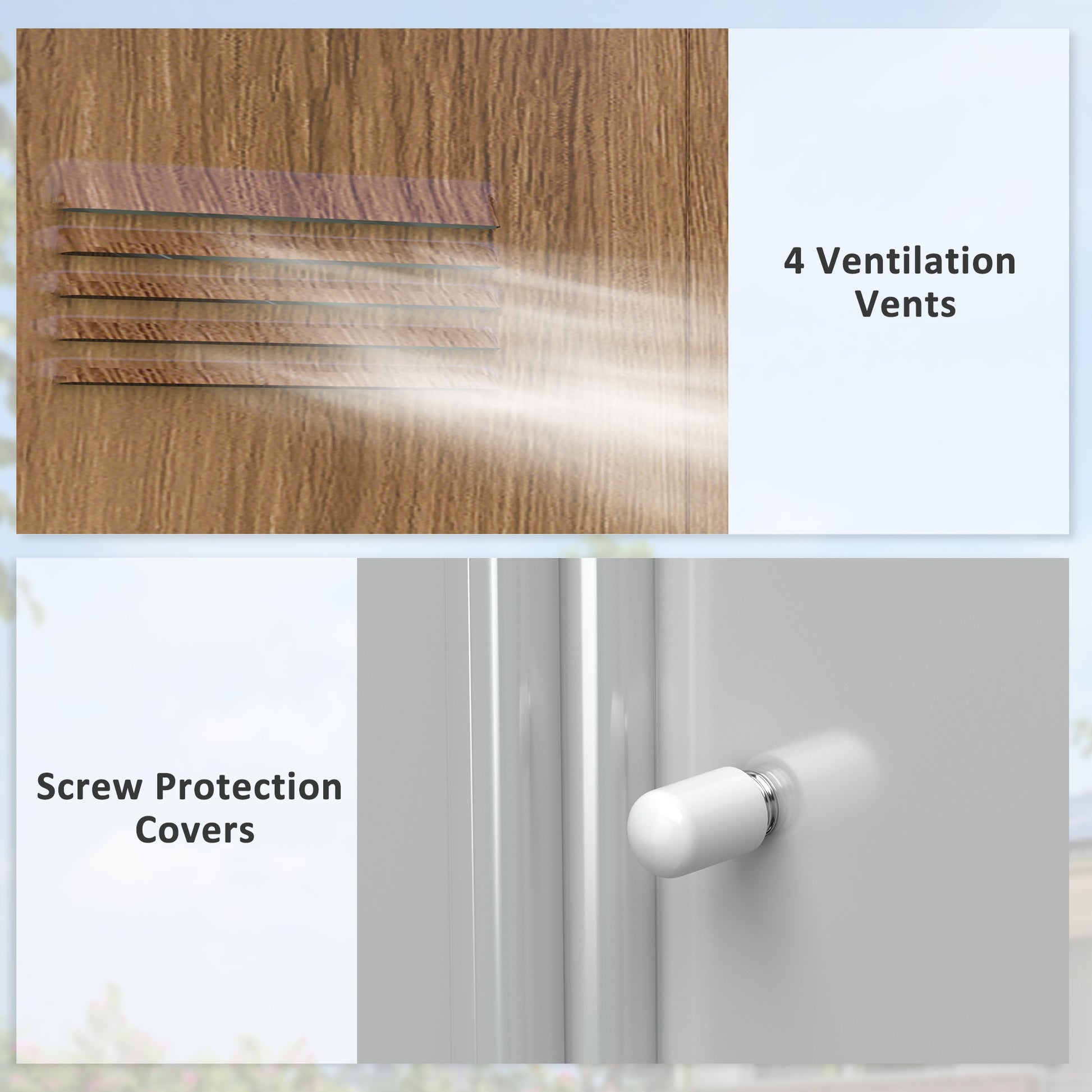 Ventilation slots: The small shed is equipped with four vents, two on the front and two on the back, promoting air circulation to prevent moisture and mildew buildup.