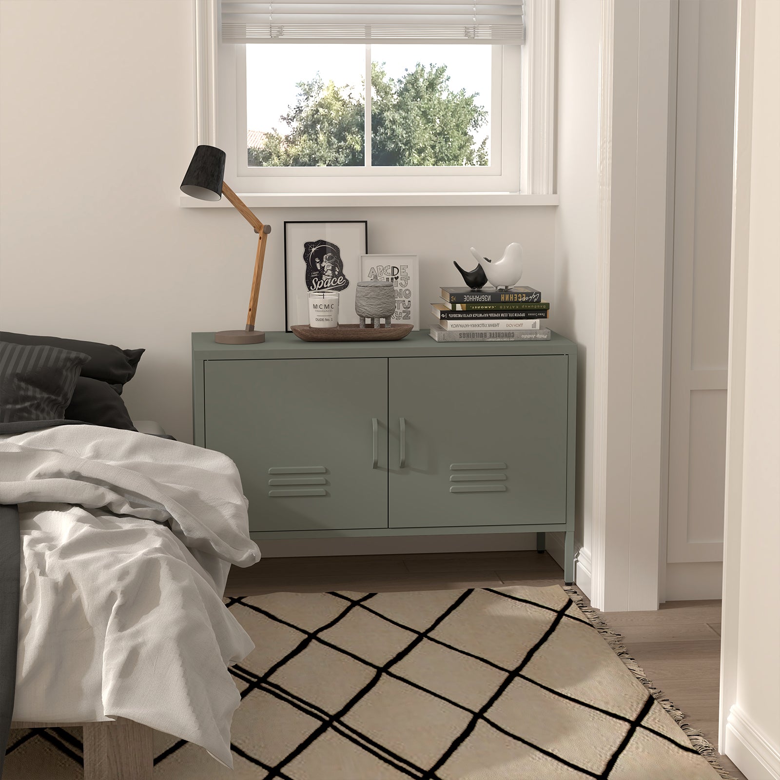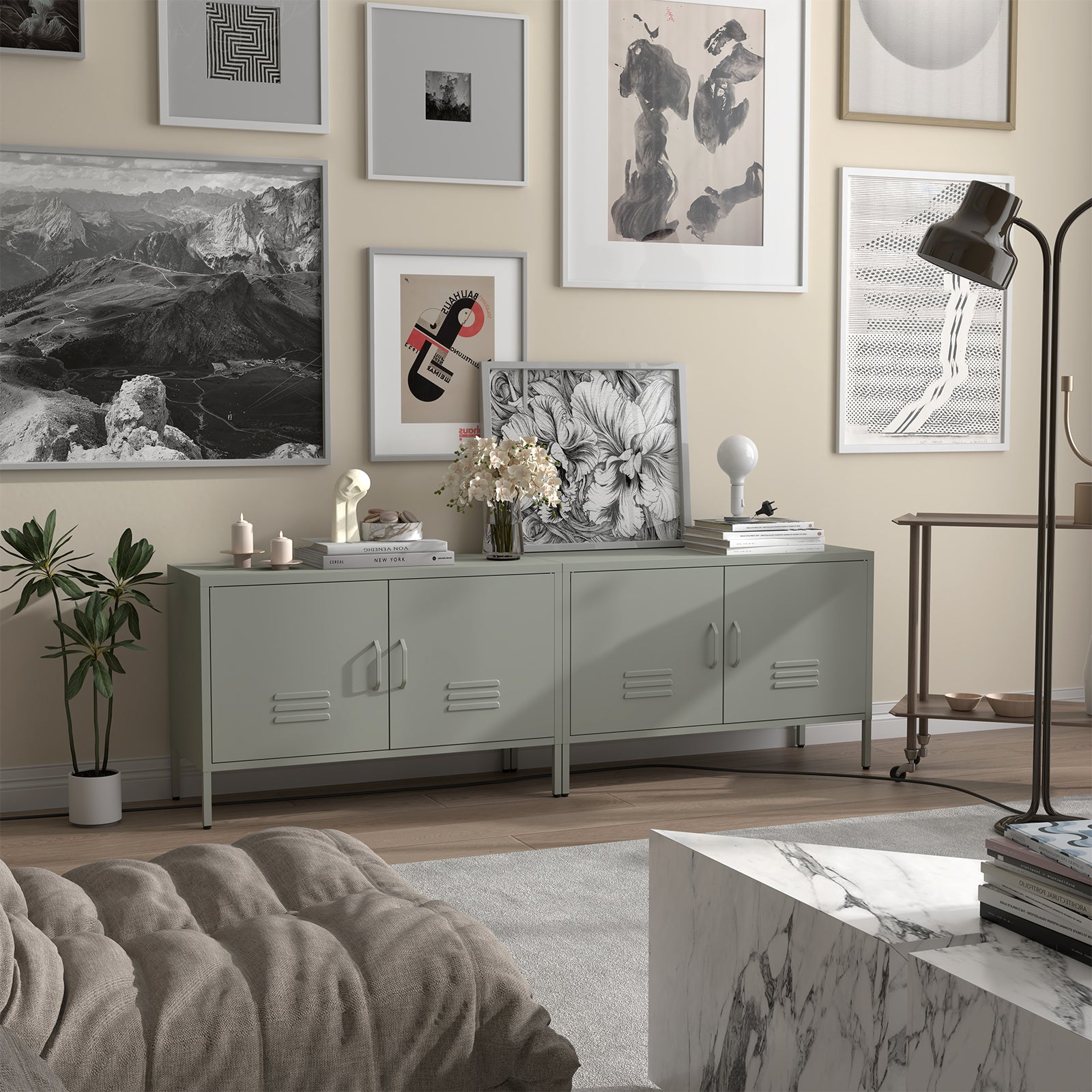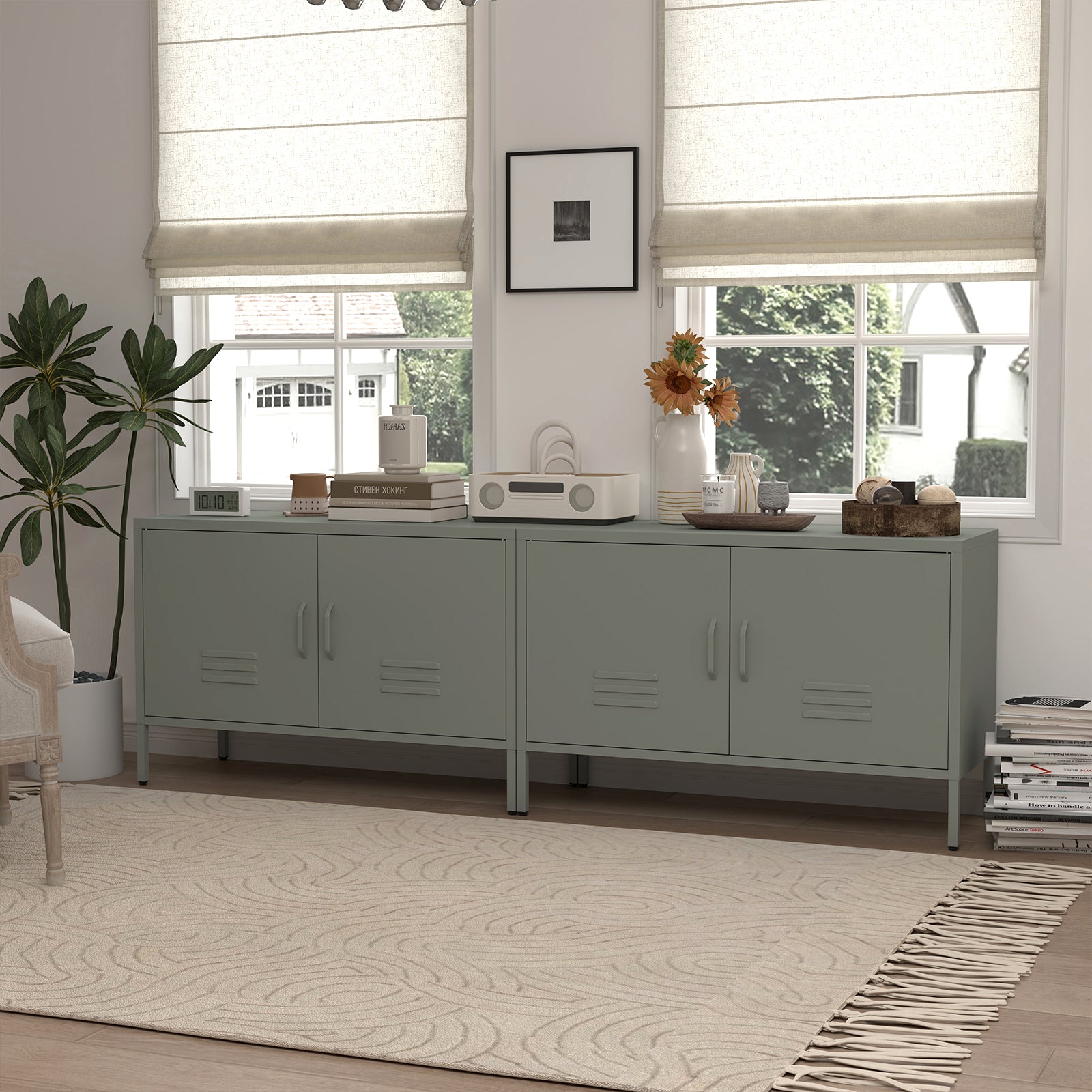 The metal storage cabinet features adjustable built-in dividers, providing ample storage space for remotes, books, DVDs, and decorations to keep your living room, bedroom, or entryway organized. The back of this two-door cabinet includes two threading holes, making it easy to organize TV and power cables, which helps avoid clutter and enhances your home's overall aesthetics.