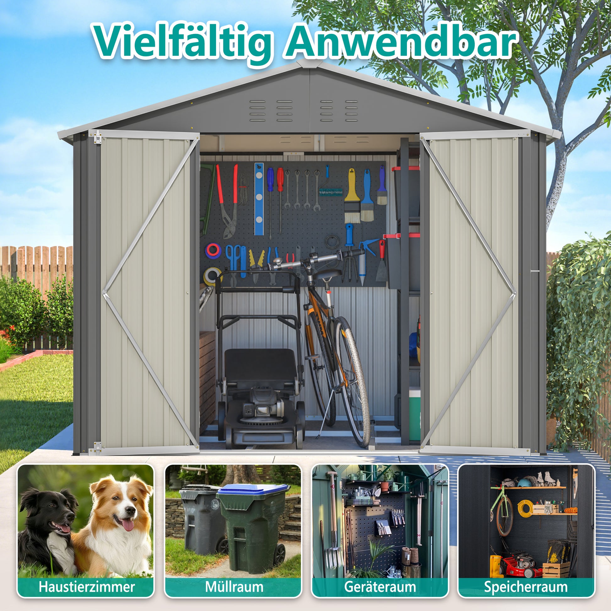 Perfect for your garden tools and equipment, this high-quality metal tool shed, measuring approximately 8x6 feet (2.20 x 1.80 m), is the ideal solution for safely storing your garden tools in a dry environment. The spacious shed offers more than enough room for lawnmowers, grills, garden furniture, tools, and all other garden equipment.