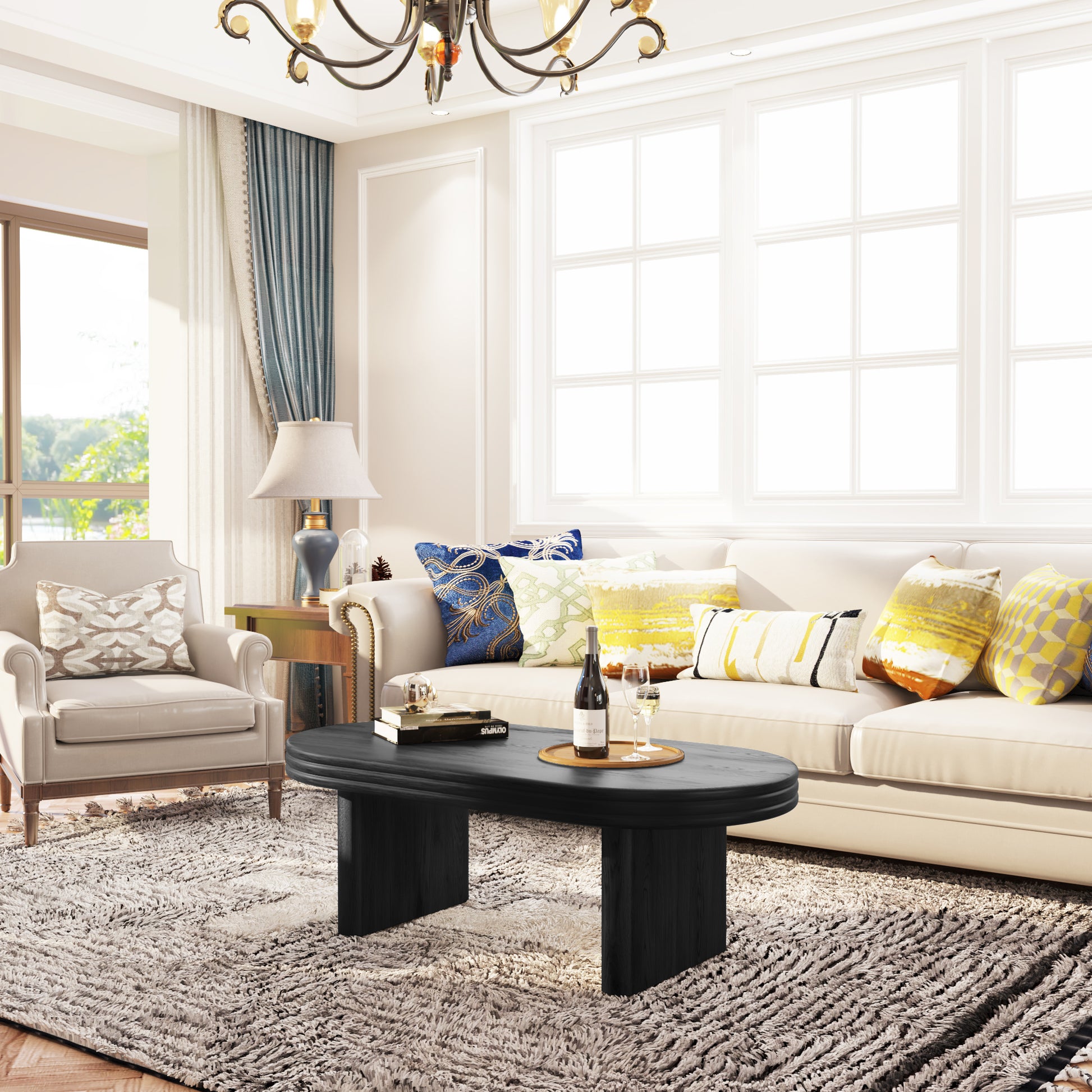 Mid Century Modern Oval Fluted Coffee Table Rustic Wood - Black