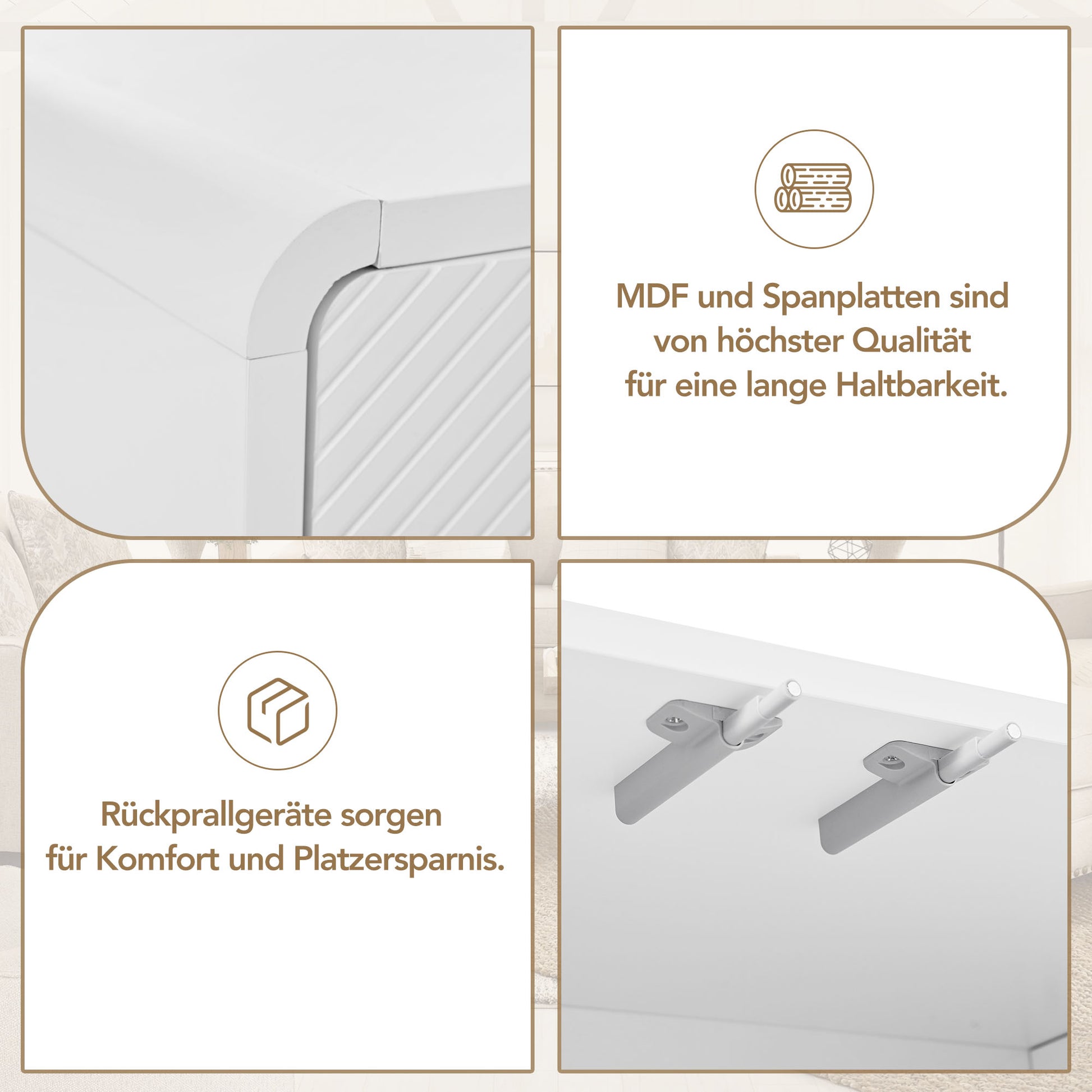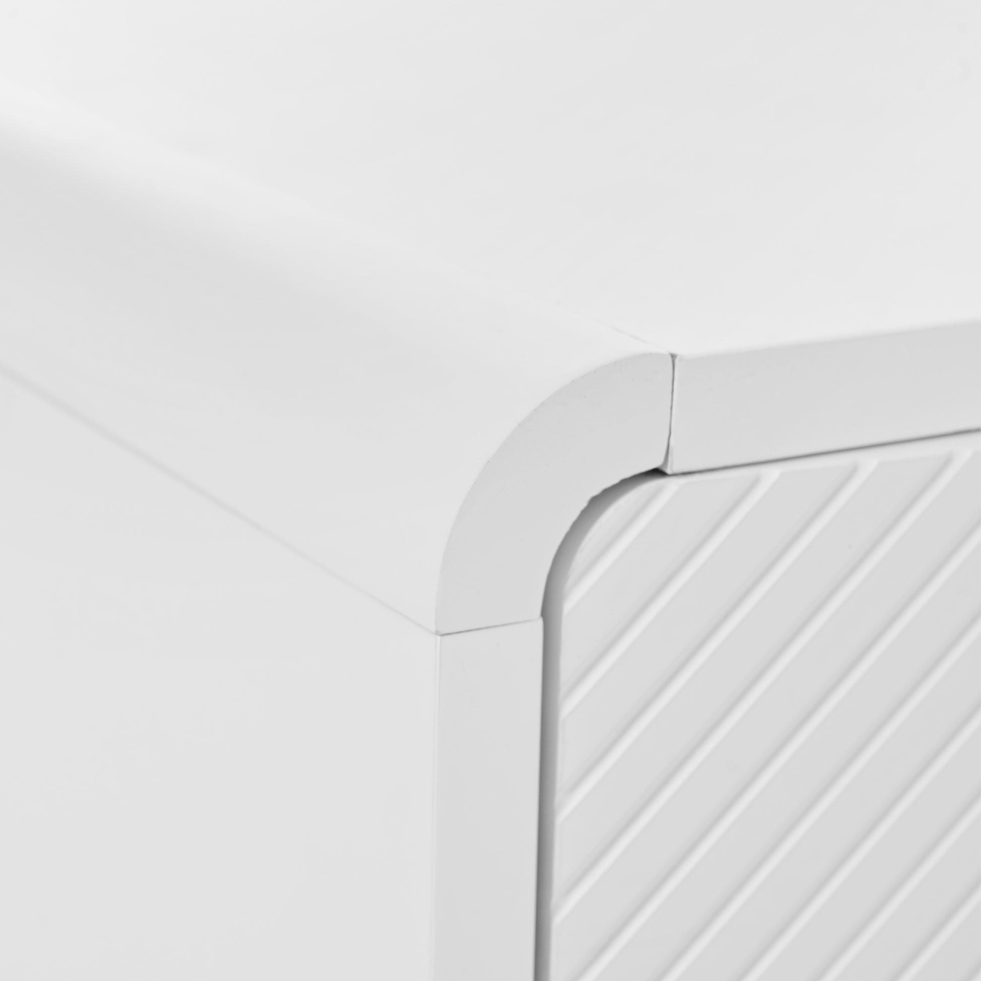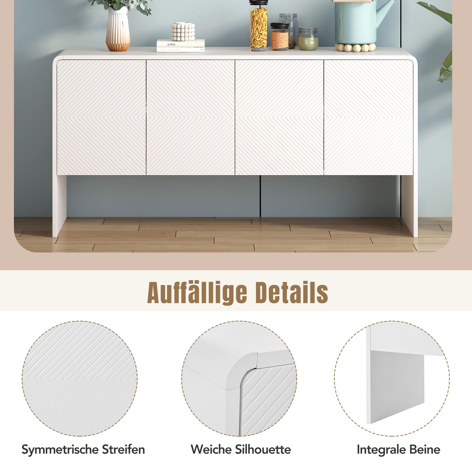 This sideboard, crafted from MDF and particleboard, boasts a sleek, minimalist style that blends seamlessly into modern interiors. Its light color scheme allows it to integrate effortlessly into any home décor. The grooved details on the four doors add textural interest without creating bulk or clutter, and the harmoniously rounded edges create a soft silhouette.