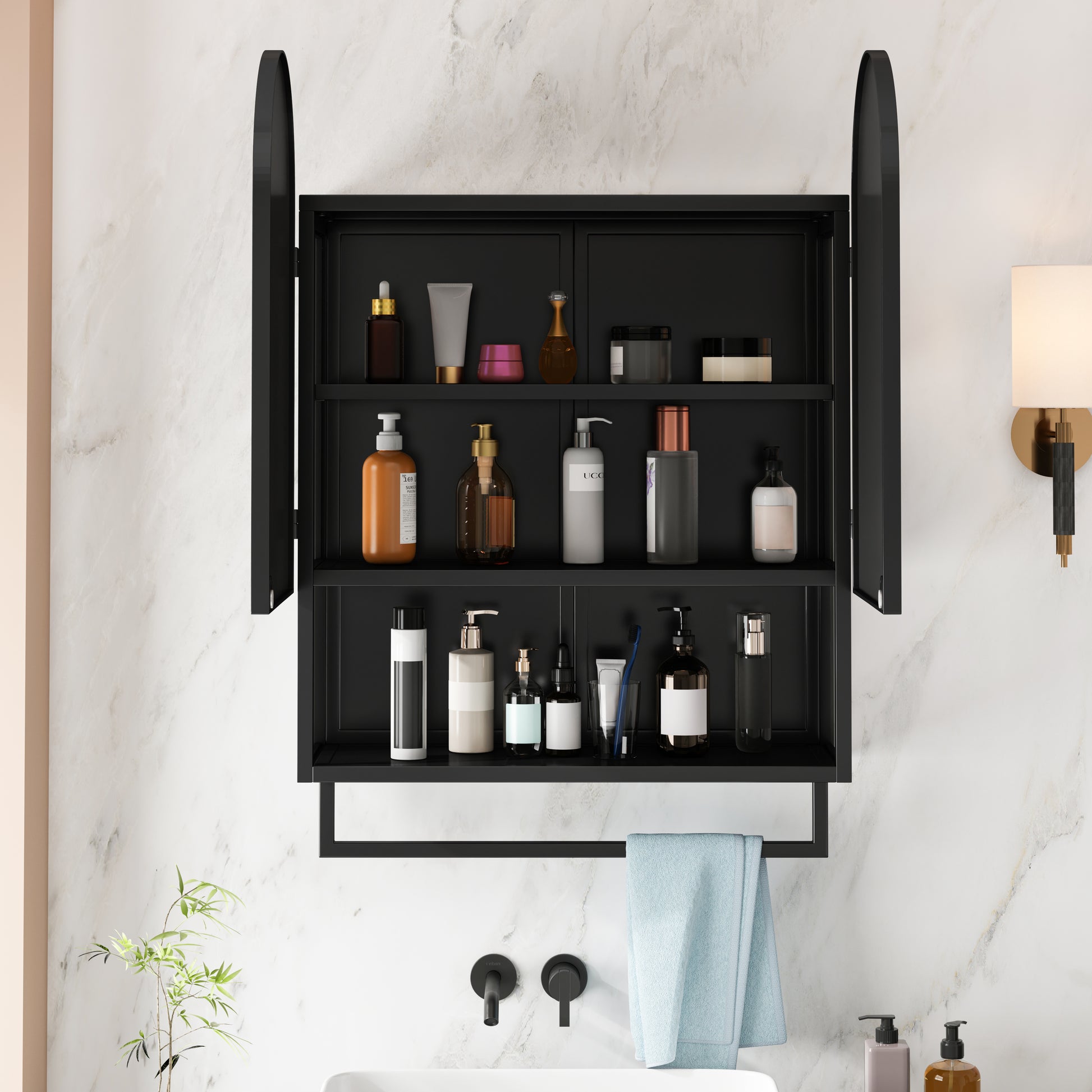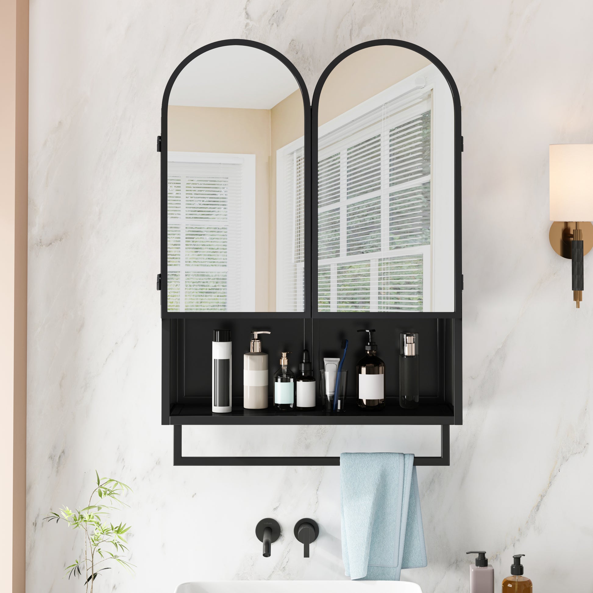 Mirror Cabinet 60CM Double-Arched 2 Doors Open Shelf Metal Black