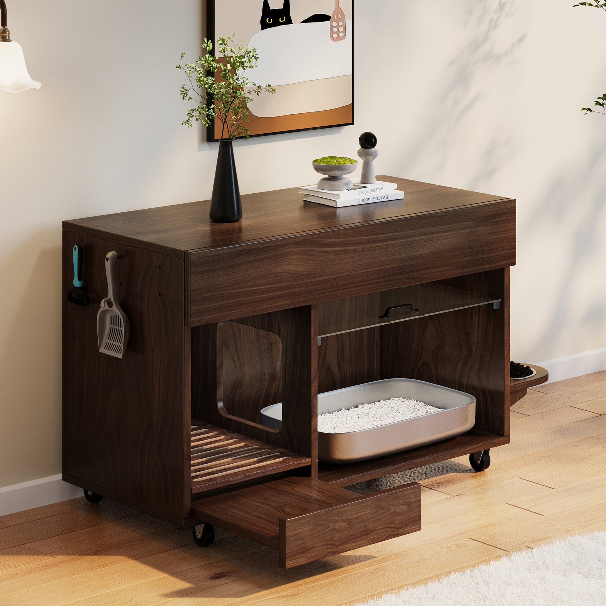 Mobile Cat Litter Box Cabinet with Food Bowls, Sand Tray, Pegboard - Walnut