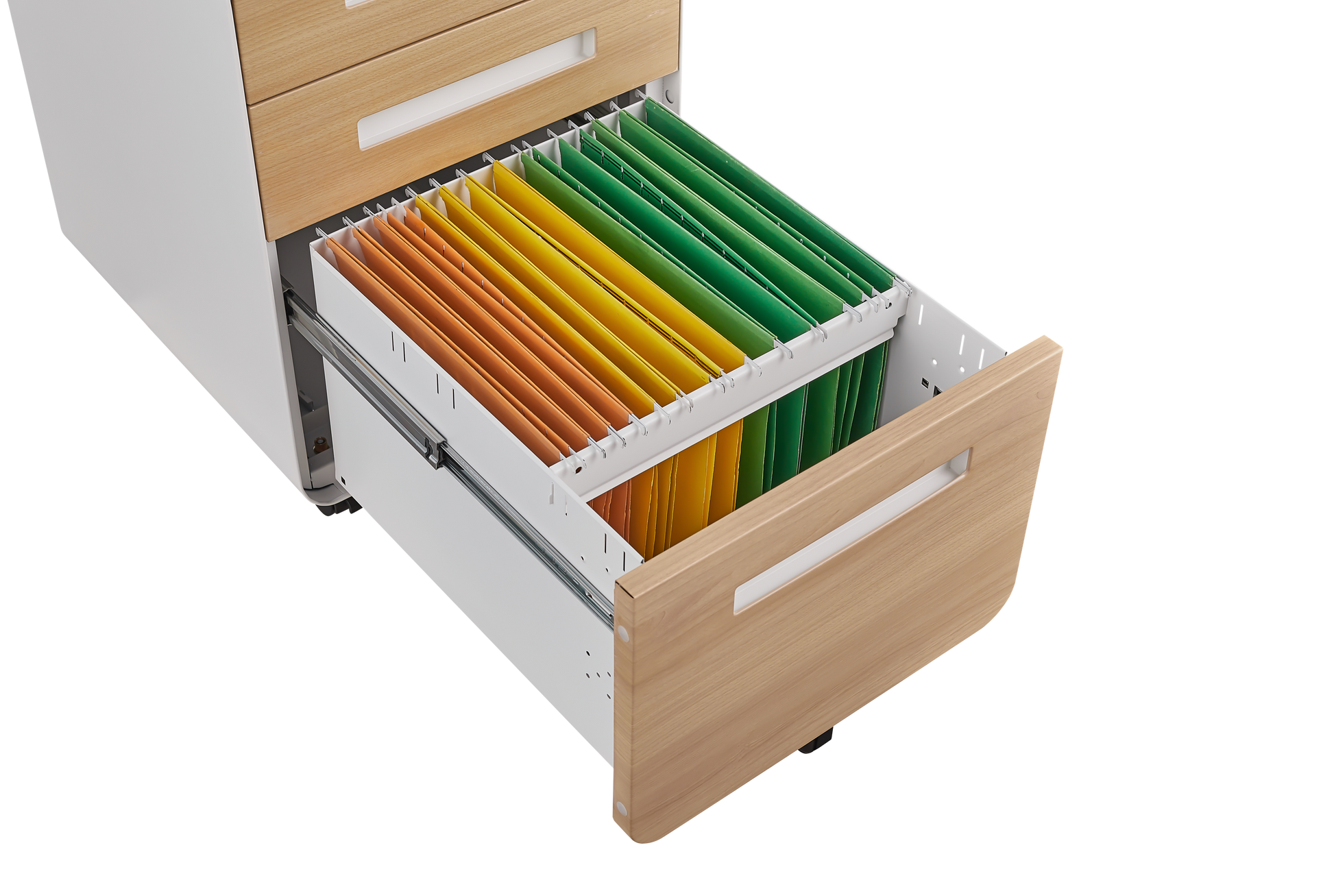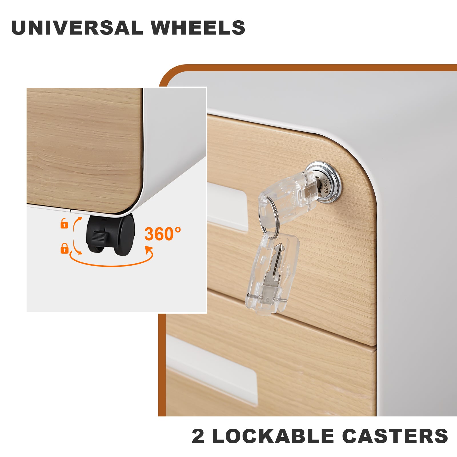 Mobility and stability are ensured by four universal wheels, with the two front wheels featuring a locking function. The anti-tilt mechanism ensures the cabinet remains stable even when the large capacity bottom drawer is fully extended.
