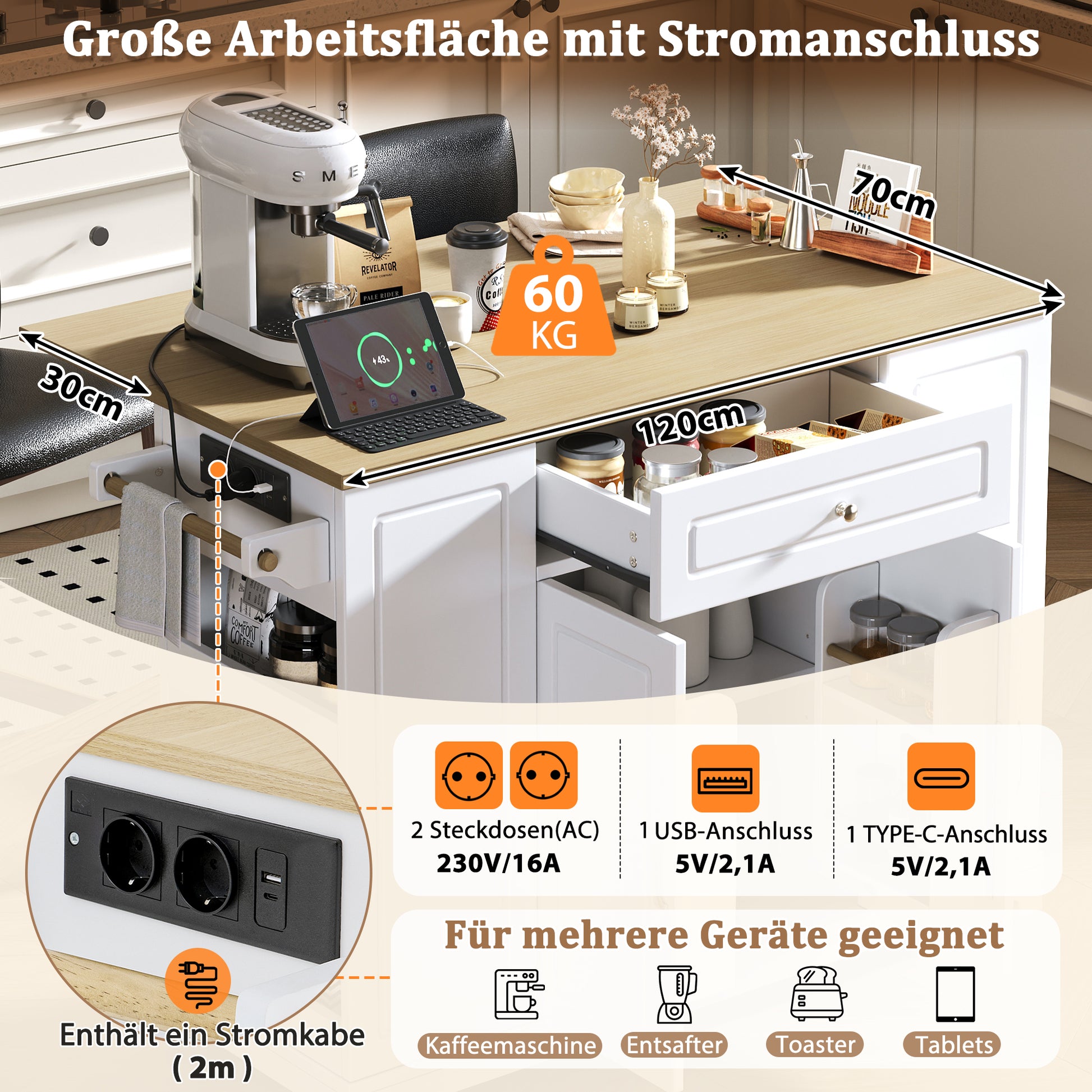 This kitchen island features a fold-out worktop measuring 120cm x 40-70cm, which can be extended as needed. The sturdy worktop supports up to 60 kg. It includes two integrated AC outlets for small appliances such as coffee makers, one USB port, and one USB-C port for charging smartphones and tablets – for a modernized smart kitchen.