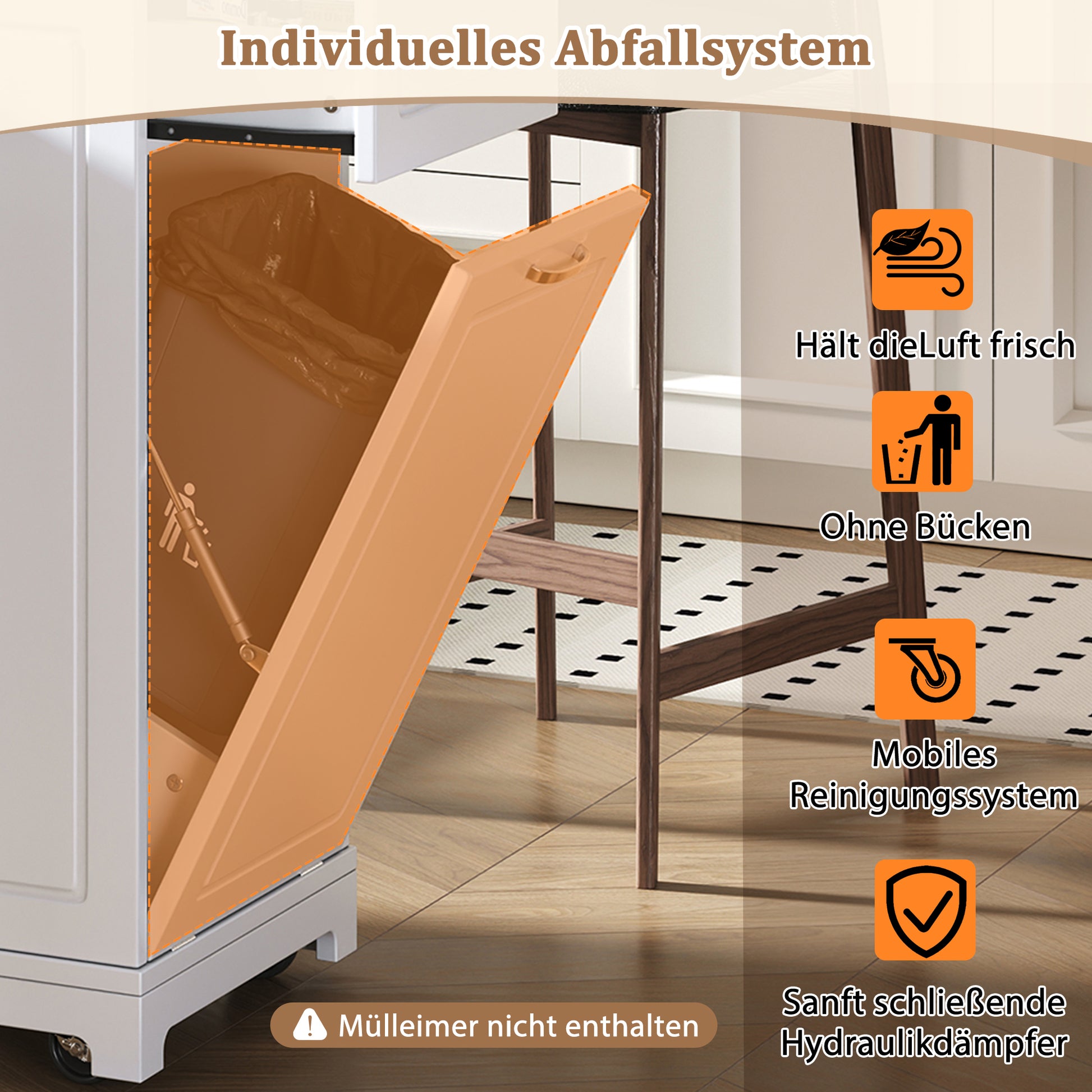 The specially designed waste bin compartment of this kitchen island not only keeps the air fresh but also serves as a practical, mobile waste disposal system for hygienic and organized waste management. The ergonomic design eliminates the need to bend down, thanks to the convenient drawer function. Soft-closing hydraulic dampers ensure durability and ease of use. Perfect for modern households that value cleanliness, comfort, and style.