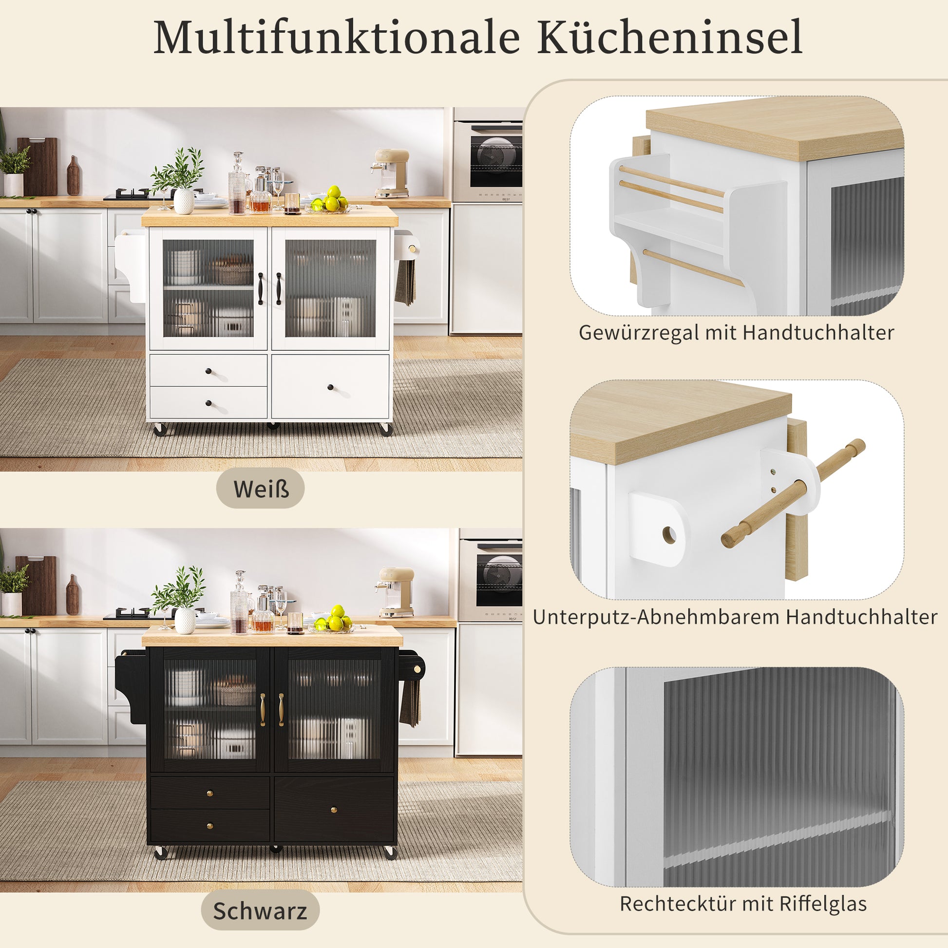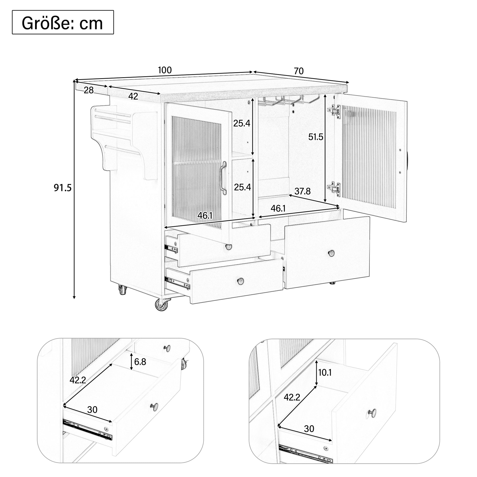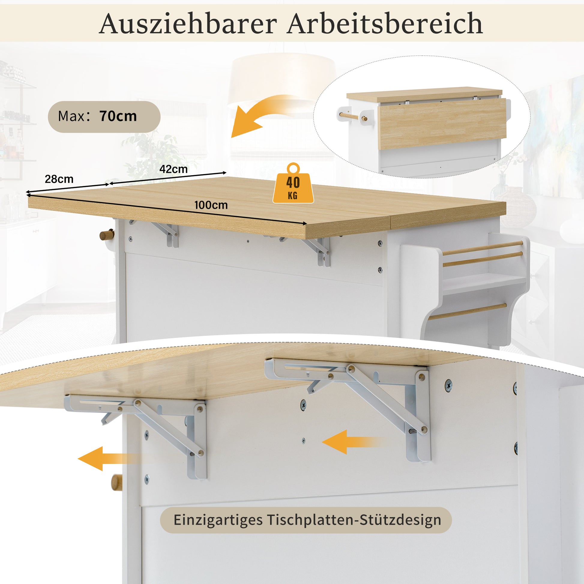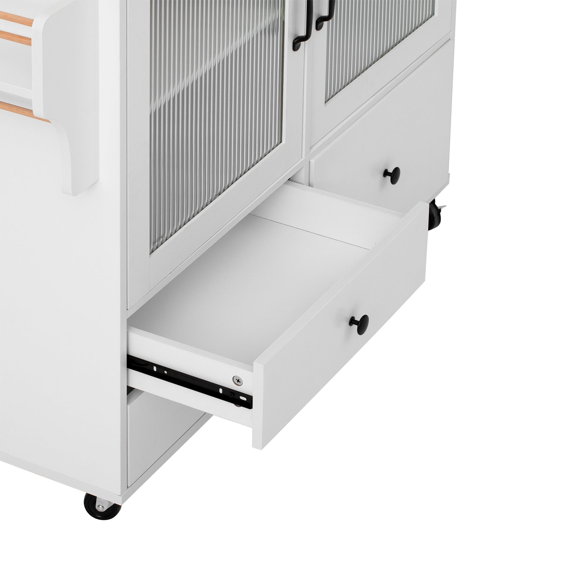 Mobile Kitchen Island Extendable Table Wheels Wine Glass Holder Storage - White