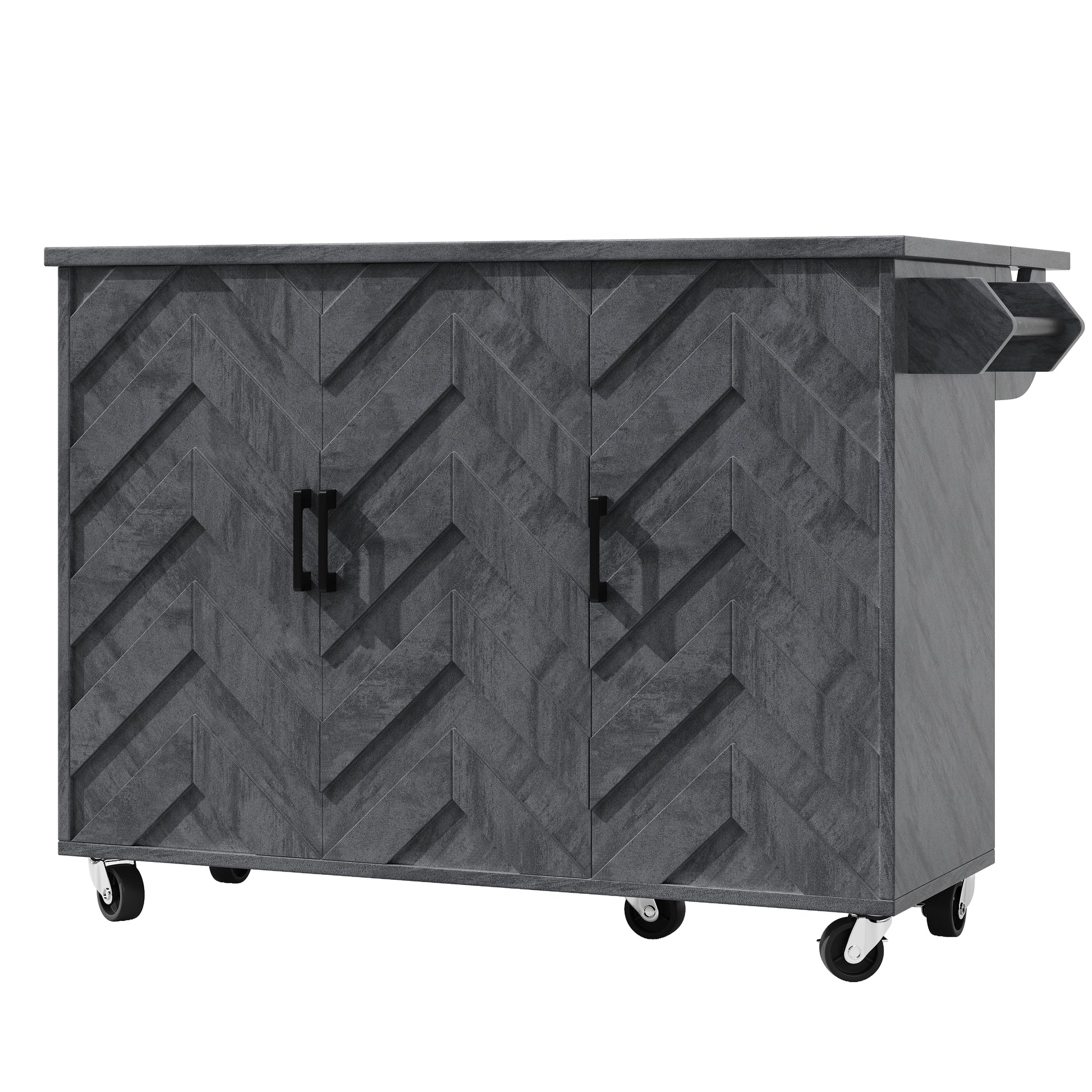 The metal support bar of the towel rack and the cabinet handles are made of high-quality metal that is aesthetically pleasing and rust-resistant. The entire kitchen cart is constructed from high-quality MDF panels, ensuring durability and easy cleaning. Five 360-degree swivel casters, including two lockable ones, allow for versatile use in various environments.