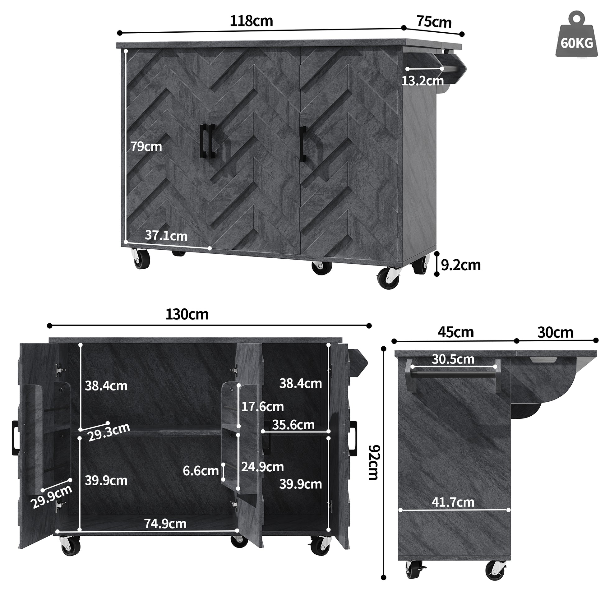 The kitchen island measures 118 cm long, 75 cm wide, and 92 cm high, providing ample space for kitchen use.
