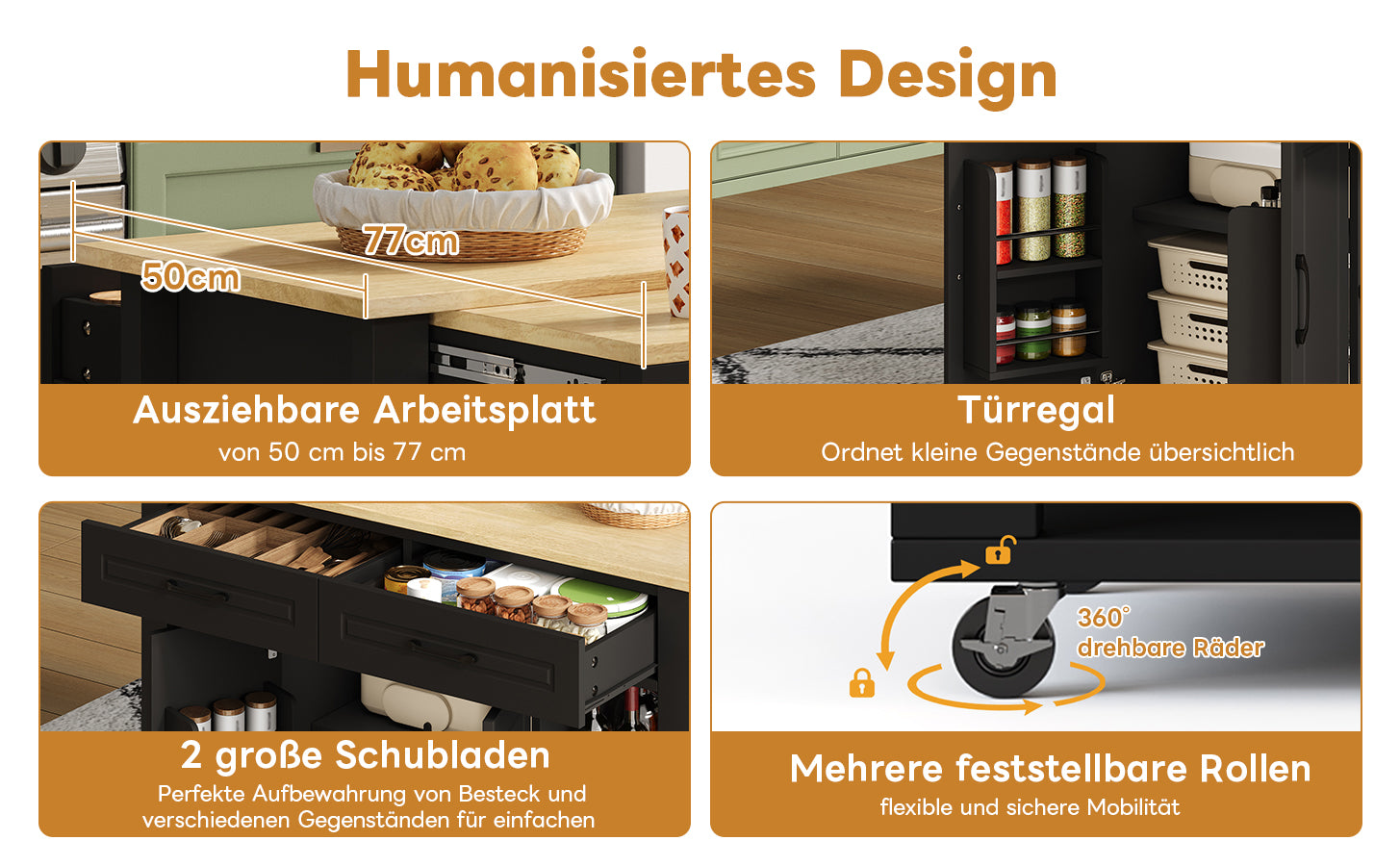 Mobile Kitchen Island with Extendable Bar Counter and Power Outlets, Wood Look