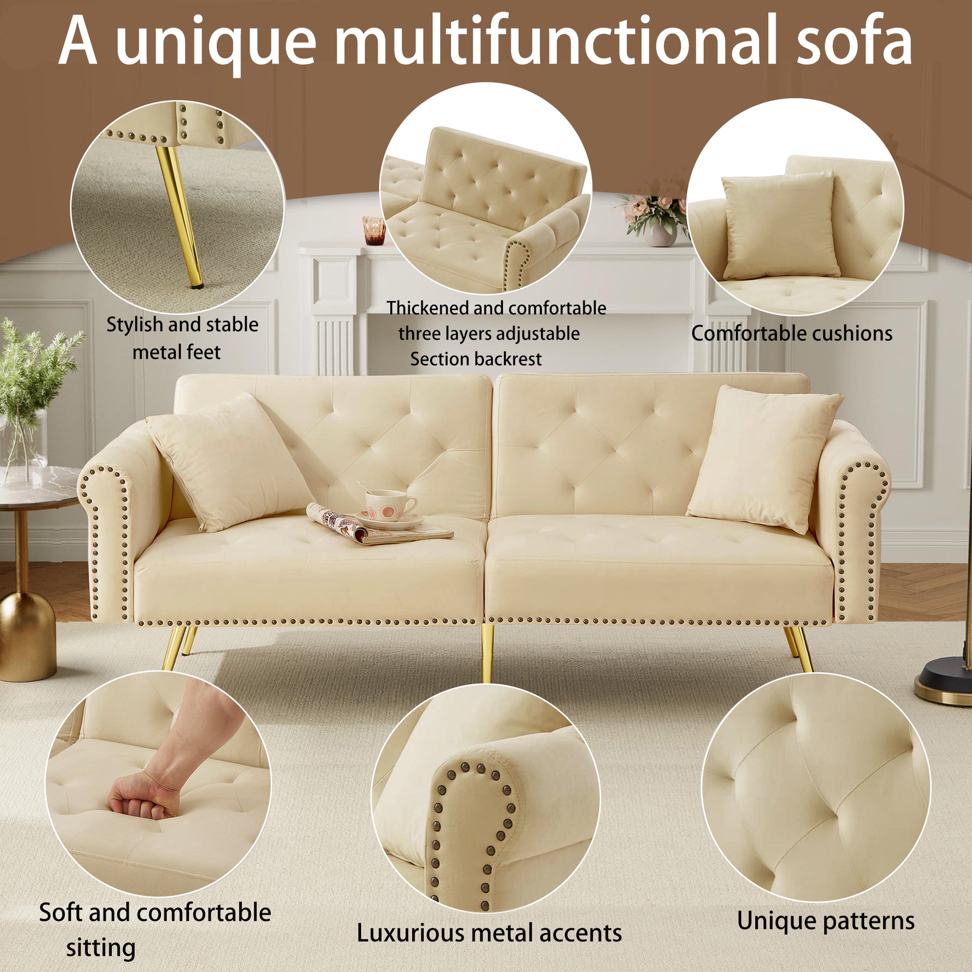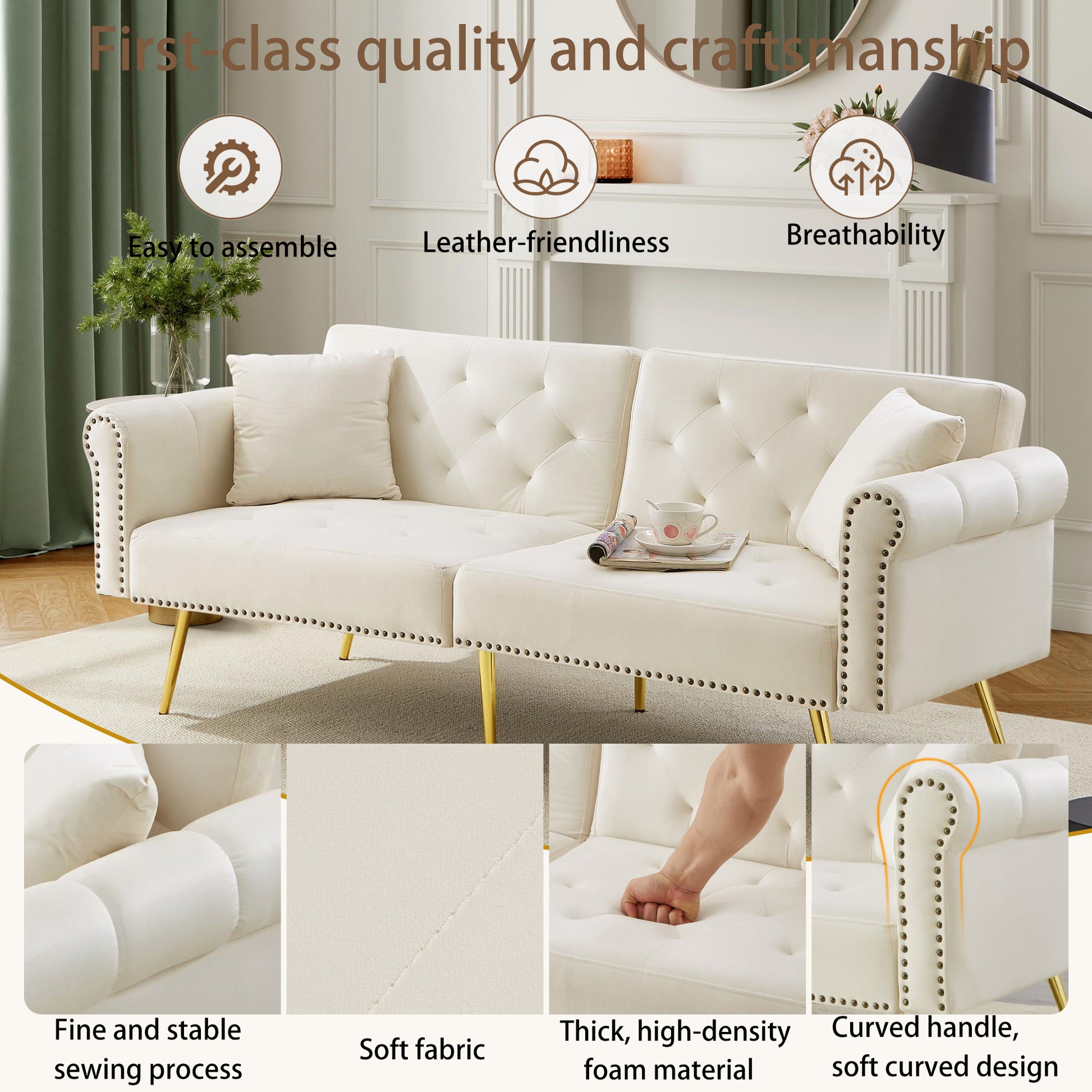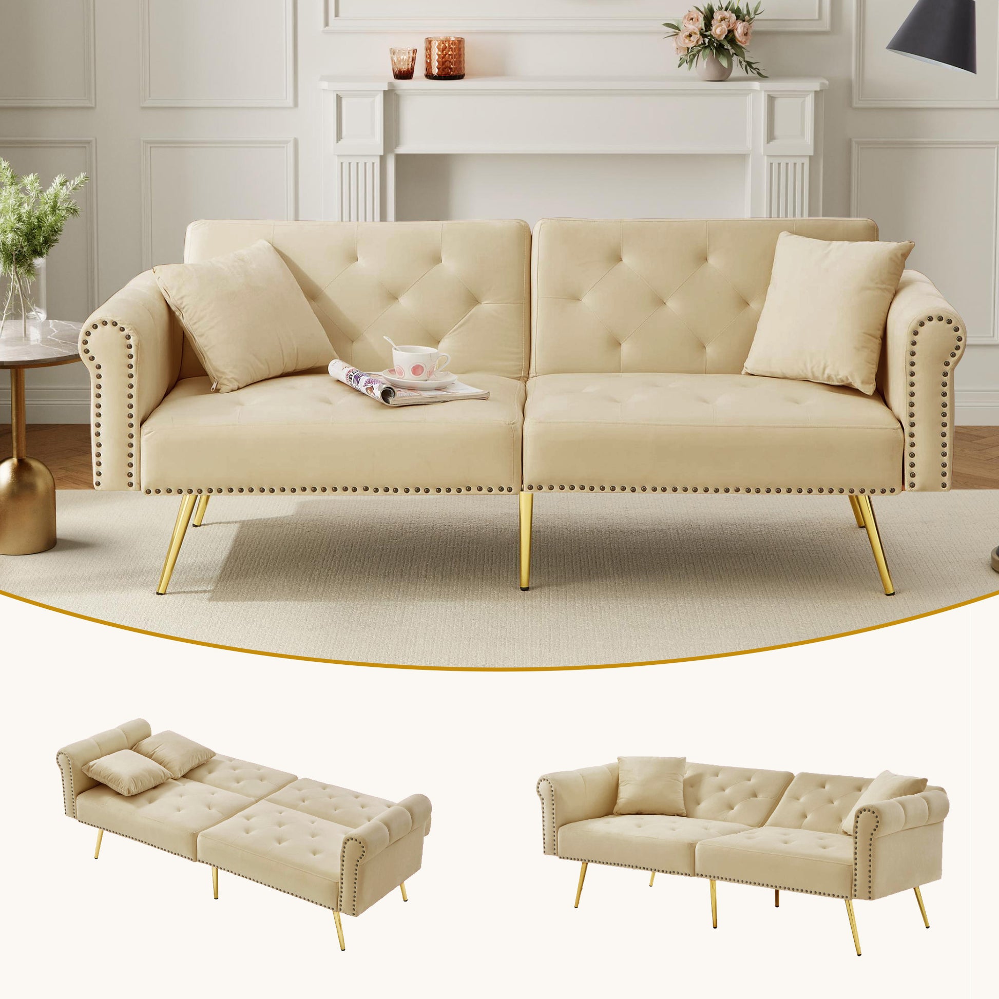 The six gold-plated metal feet not only support over 150 kg but also lend a subtle touch of luxury to the room with their polished finish. Combined with modern metal decorative elements, a harmonious design emerges. With a raised height of 24 cm, cleaning is effortless, and there are no corners that are hard to reach. The rounded armrests offer extra protection and are especially child-friendly. The stable, reinforced wooden frame ensures long-lasting durability and exceeds the weight capacity of traditional sofa beds. Whether in a small apartment, loft living room, or guest room, this sofa is a true space-saver: a stylish, luxurious sofa during the day, and a comfortable sleeping area at night. The included detailed instructions make assembly quick and easy, so you will be enjoying your high-quality home in no time.