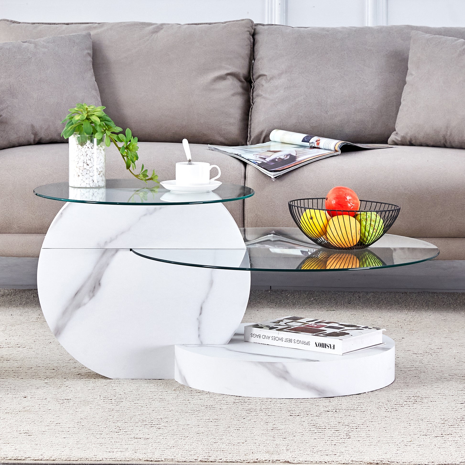 Modern Coffee Table Double-Layered Safety Glass Multi-Tiered White Marble Effect MDF