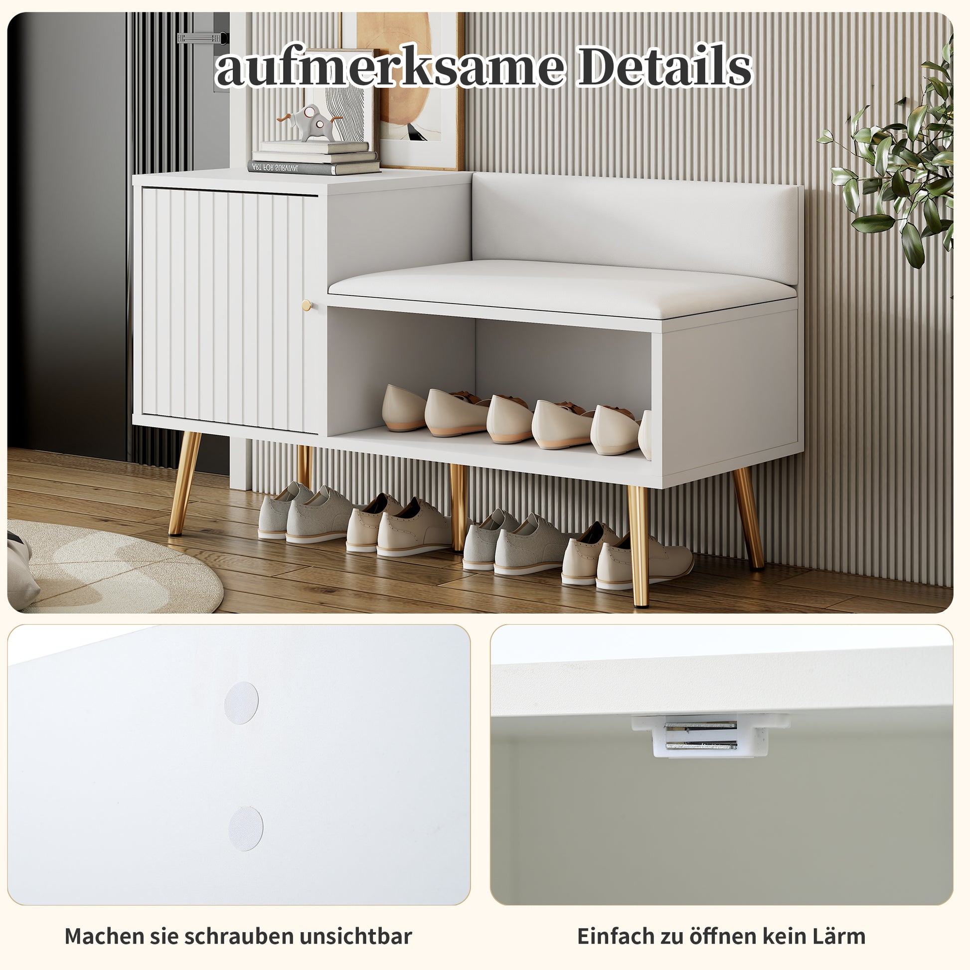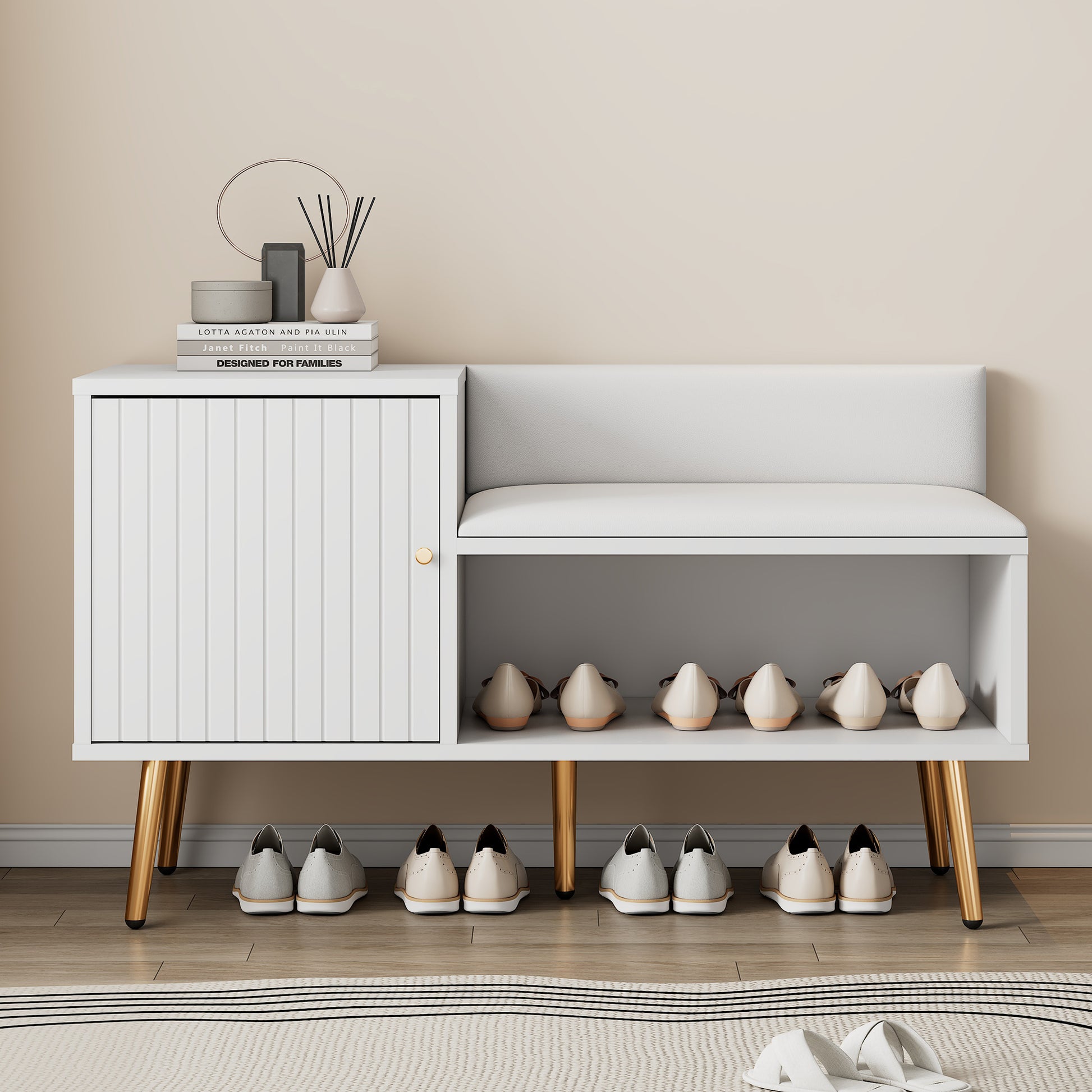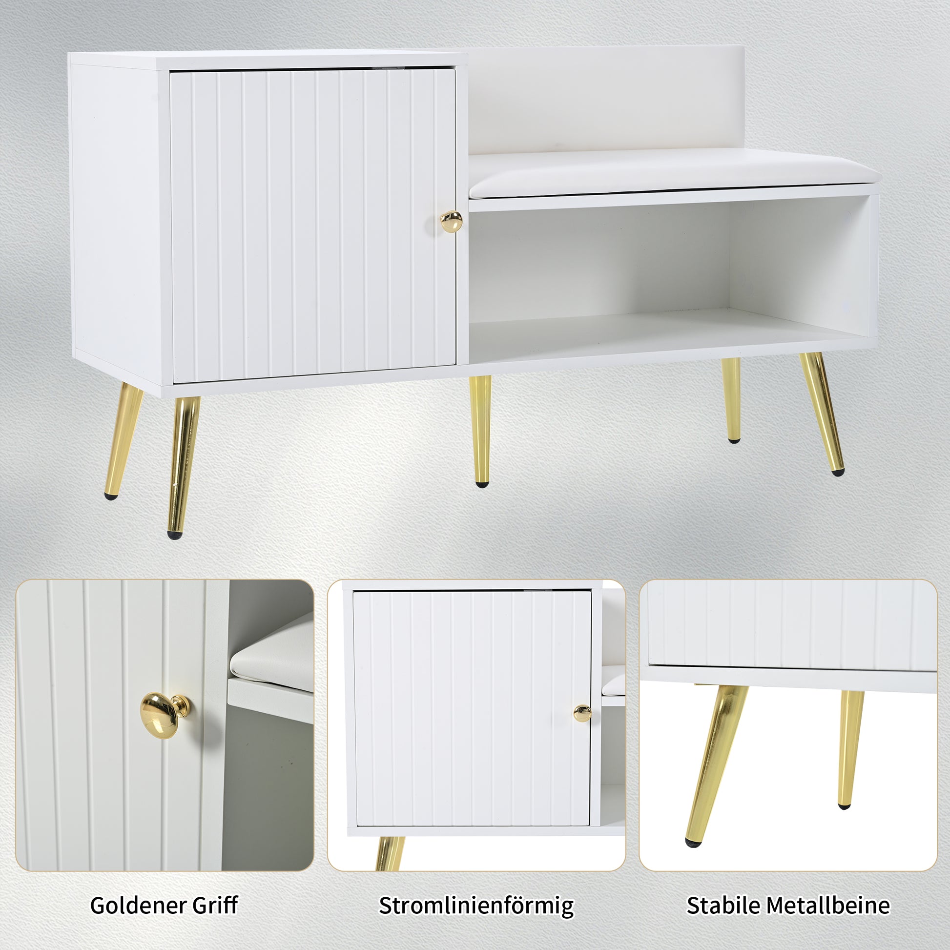 modern luxurious shoe chest with storage, upholstered bench, backrest, metal handles and legs, white