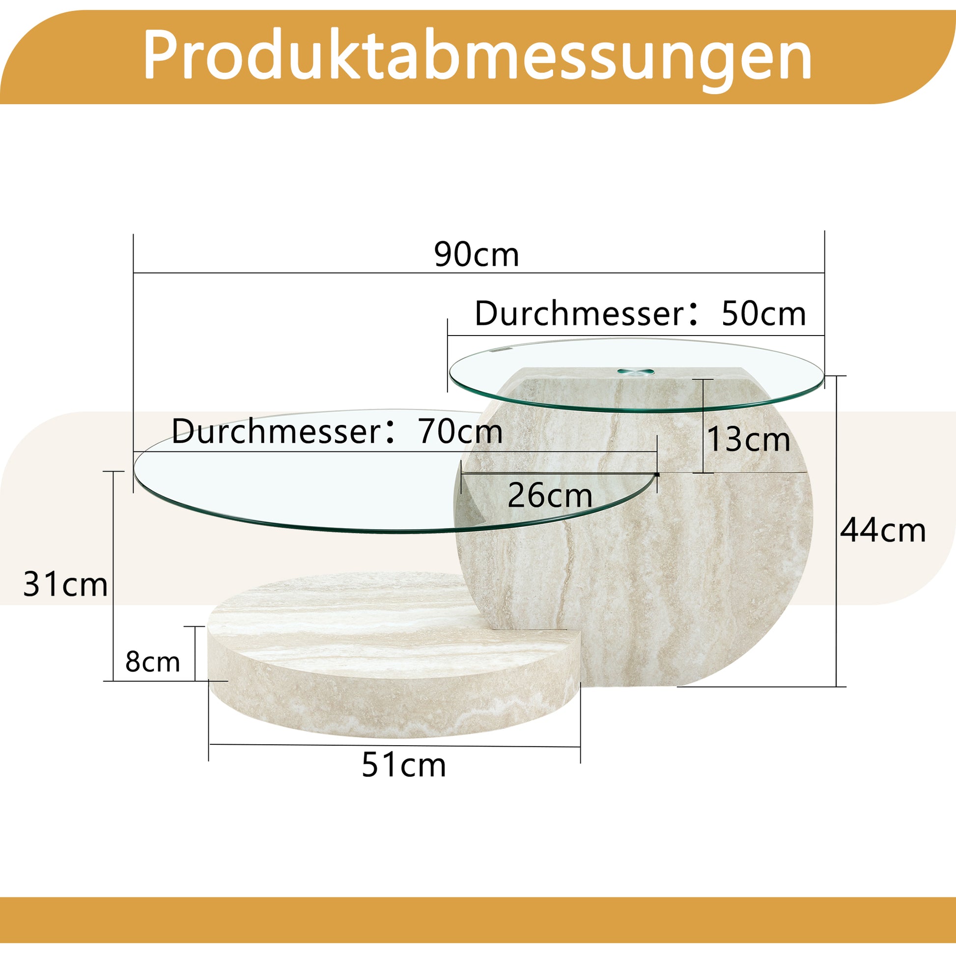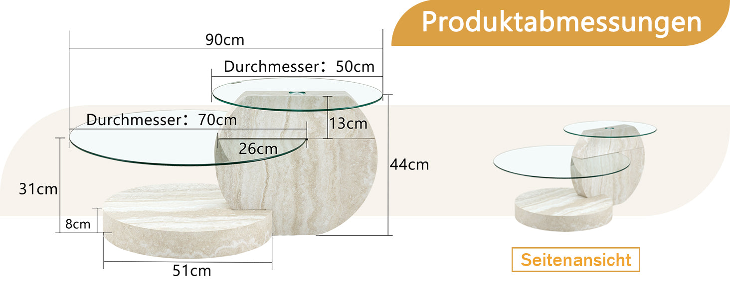 This table enhances your home's style with a spacious and generous surface. The top glass has a diameter of 50 cm, and the lower glass has a diameter of 70 cm. This practical coffee table will become the striking focal point of your living room.