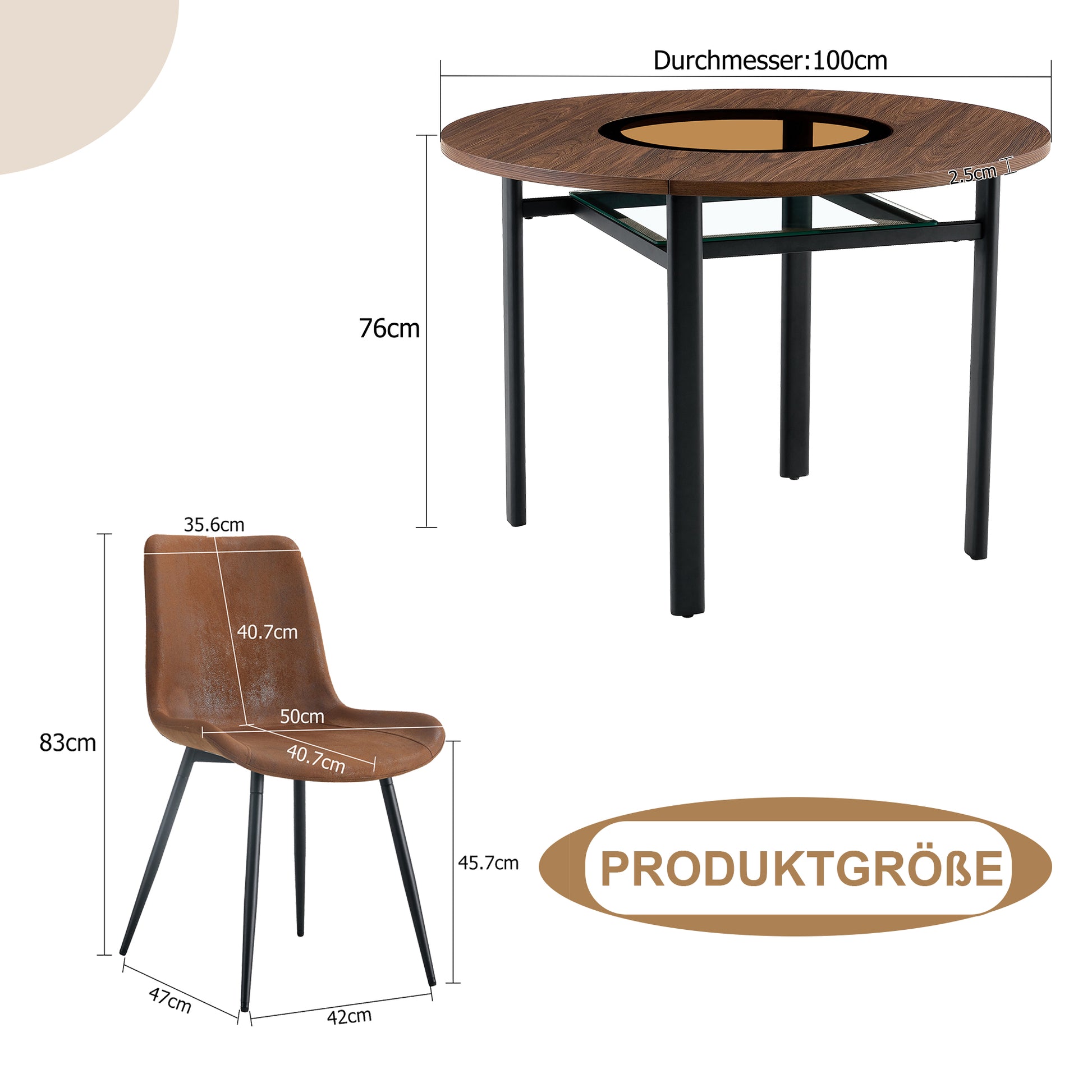 The 2.5 cm thick MDF tabletop features a fine, realistic brown wood grain, embodying a minimalist style. With a diameter of 100 cm, it comfortably seats 4–6 people for meals or gatherings and is suitable for various rooms such as dining rooms, living rooms, or open-plan kitchens.