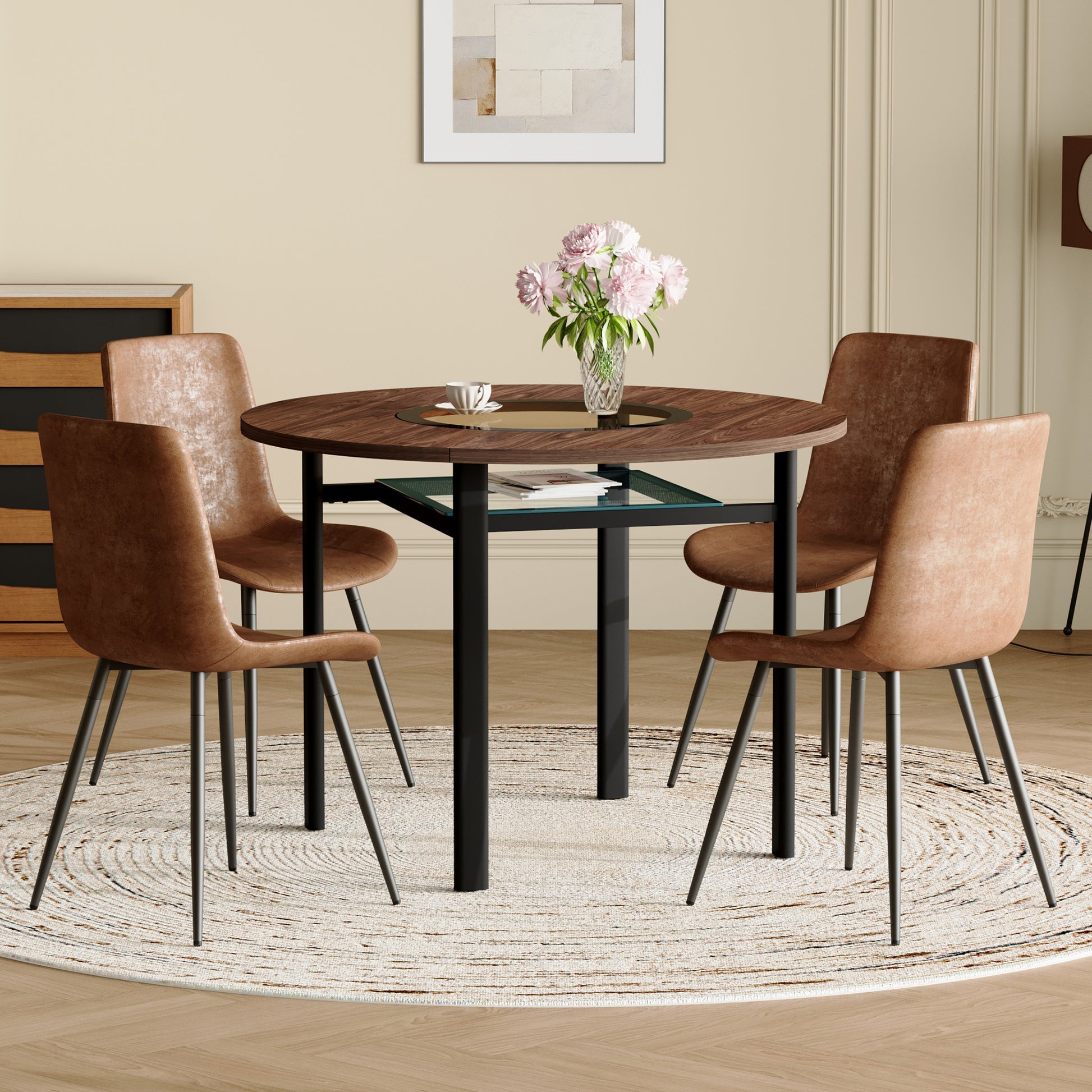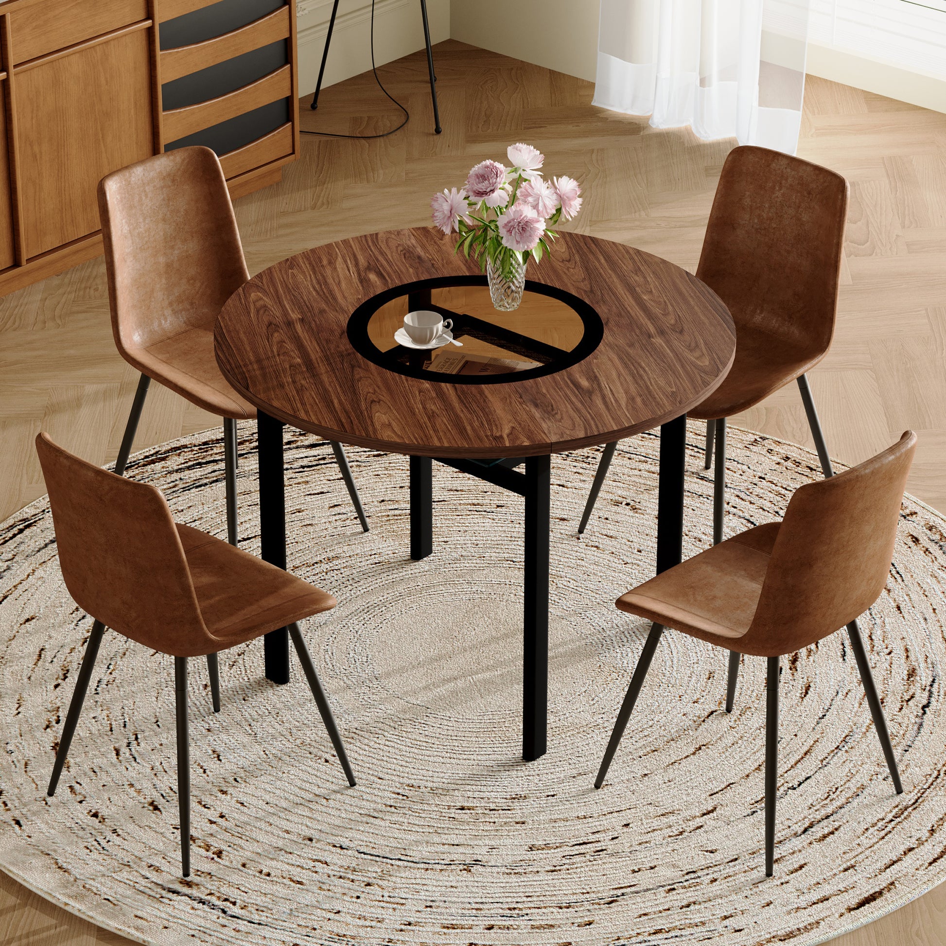 Modern Minimalist Round Table Set, 100cm Diameter, 4 Armchairs, Brown Wood/High-Tech Fabric