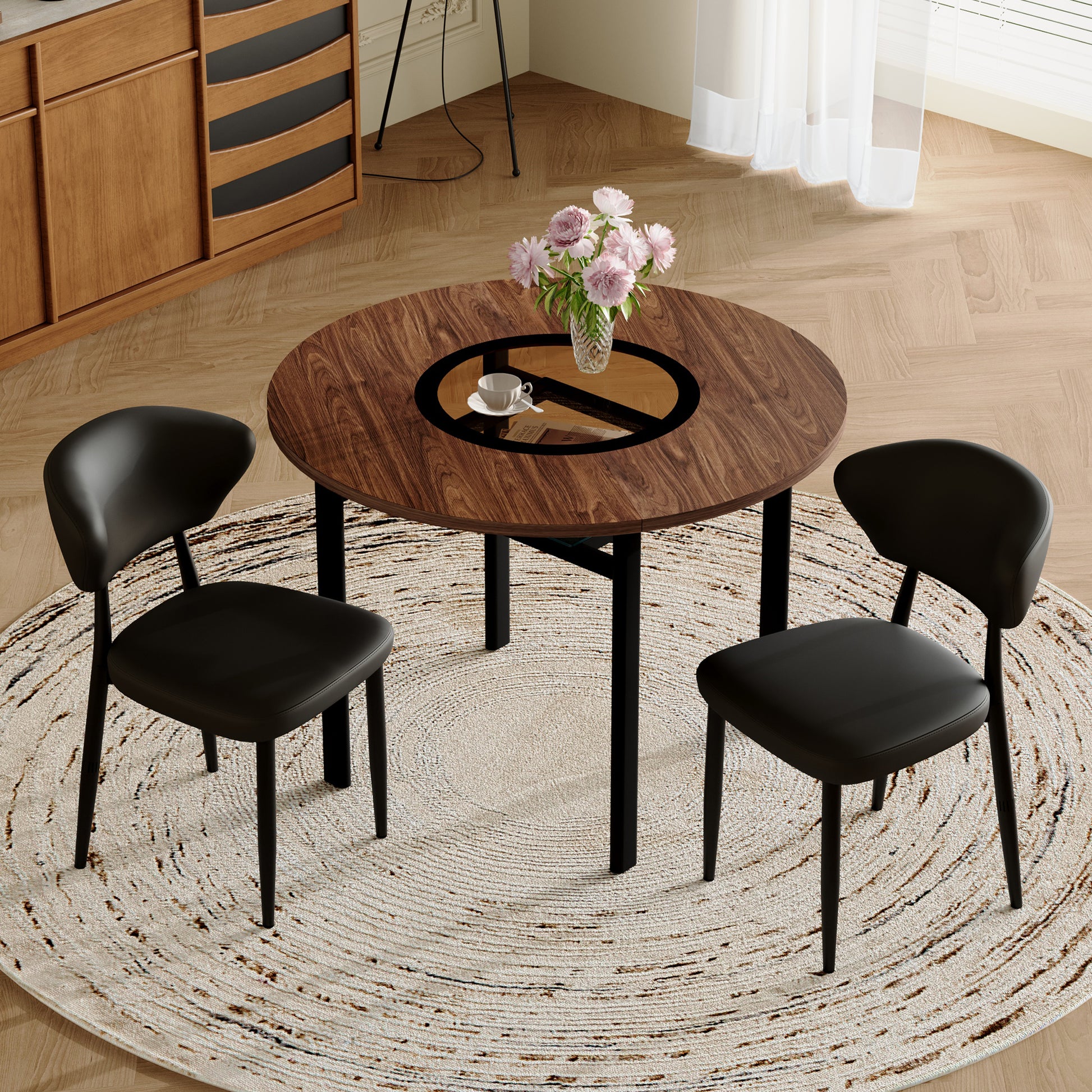 The 2.5 cm thick MDF tabletop features a fine, realistic brown wood grain, embodying a minimalist style. With a diameter of 100 cm, it comfortably seats 4–6 people for meals or gatherings and is suitable for various spaces such as dining rooms, living rooms, or open-plan kitchens.